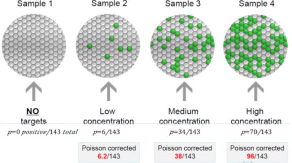 总结一下,将样本和PCR反应液加入微流控芯片,放入仪器中,通过物理方法生成单层平铺的微滴阵列,随后对每个微滴进行扩增,然后进行六通道荧光信号采集,计数阴阳性微滴,通过泊松分布计算获得靶标基因绝对拷贝数浓度。 第三代PCR主要缺点: