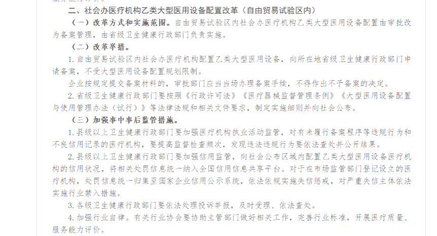 在此之前,国务院曾批准在自由贸易试验区内对社会办医疗机构配置乙类大型医用设备实行告知承诺制,而此次国家方案则直接确认在全国范围内,社会办医疗机构乙类大型医用设备配置许可正式落地告知承诺制。除此之外,在自由贸易试验区内取消行政审批、改为备案制。真正意义上的彻底放开已经开始试点,而从自贸区试点到全国范围执行,只是时间问题而已。