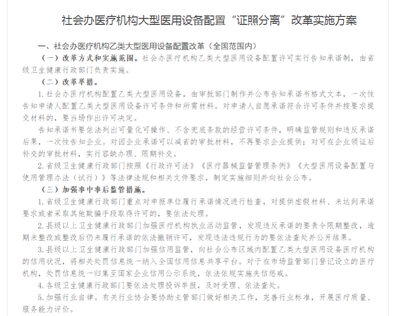 而不论是承诺制还是备案制,随着本次方案的公布,对于社会办医疗机构以及设备厂商来说,意义重大。 全面放开,大型医疗设备市场或将激增