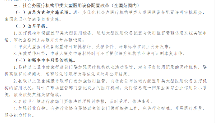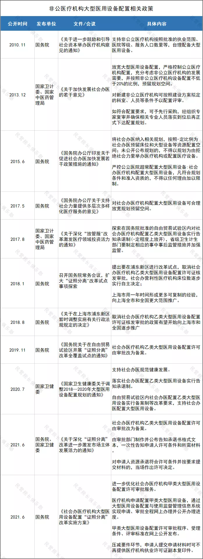 据相关数据显示,从2010年开始,国家至少有11个相关举措,提到了要对“社会办医配置大型医用设备”进行优化改革。
