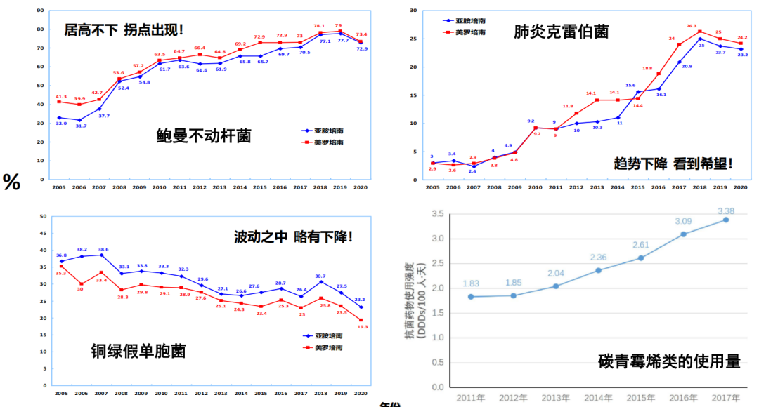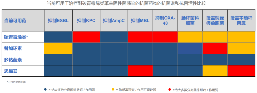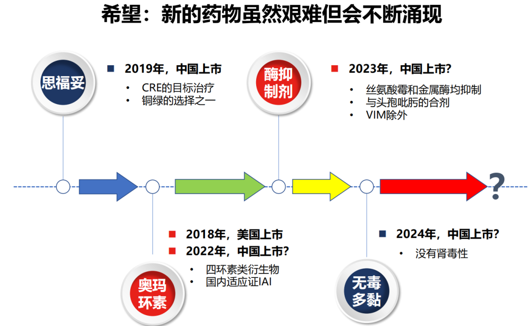 非常高兴与大家一起探讨关于耐药菌的治疗。大家知道细菌感染属于一个永恒三角,这个「三角」解决起来有点难。 最近世界卫生组织(WHO)联合世界动物卫生组织,以及联合国粮农组织,联手将抗菌药物统一命名为抗微生物药物(Antimicrobials),就是希望大家能合理地应用。但实际上如果真的要应用起来,其中的差别会很大。打个比喻:有人看到一幅落霞的美景,水面上有无数飞鸟,有水平的人也许会立刻吟诗「落霞与孤鹜齐飞,秋水共长天一色」,而到达不了那个水平的人看到这样的景色,只会大呼一声「这么多鸟!真好看!」这个比喻的意义是,每个人的临床思维,都会根据各人的眼界不同而有所不同,高水平与低水平之间差别巨大,这是由于抗菌药物的合理应用涉及很多方面,但我们最不希望是没有临床思路而只有临床「套路」。 碳青霉烯类抗菌药「倒下」后,能指望的是替加环素、多黏菌素、思福妥「三剑客」……但中国革兰阴性菌感染时「三剑客」也会遇到难以解决的困境 我们知道碳青霉烯类抗菌药是大家都认可的、到目前为止治疗严重感染最重要作用的药物。其结构特殊,与青霉素类的青霉环相似,但噻唑环上的硫原子为碳所替代,6位羟乙基侧链为反式构象,正是这个构型特殊的基团具有超广谱的、极强的抗菌活性,对β-内酰胺酶高度的稳定性以及毒性低等特点;其抗菌谱广:包括革兰阳性菌、阴性菌、需氧菌、厌氧菌均有很强的抗菌活性:公认为目前上市抗菌药物中的最强者;适应证宽:在多重耐药菌感染、需氧菌与厌氧菌混合感染、重症感染及免疫缺陷患者感染中发挥着重要作用。 可是大家知道碳青霉烯类抗菌药物是如何分类的吗?其实过去只有一类(即第二类),包括亚胺培南、美罗培南、帕尼培南、比阿培南、多利培南。后来出现了厄他培南,后者对非发酵菌无效,因此把它们分成了两大类(厄他培南为第一类)。但是所有这些碳青霉烯类再强也不能治疗MRSA,因此希望出第三类,能够同时治疗MRSA的碳青霉烯类抗菌药物。 看看现状:我们有前6种抗菌药物(中国没有引进多利培南),大家好像认为没有能够治疗MRSA的,但接着看,有了托莫培南和阿祖培南,这是能够治疗MRSA的碳青霉烯类。又有人说,碳青霉烯类只有静脉、没有口服的。有了,替吡培南,可以口服。又有人说,这些都是国外的,有我们自己国产的吗?也有了,百纳培南、艾帕培南。因此,碳青霉烯类抗菌药物在不断的发展当中。 这是2017年2月WHO首次发布12种致命耐药细菌清单。其中,被列为1类重点(极为严重)的就是碳青霉烯类耐药的鲍曼不动杆菌(CRAB),碳青霉烯类耐药的铜绿假单胞菌(CRPA),以及碳青霉烯类耐药的、产超广谱β-内酰胺酶(ESBL)的肠杆菌目(CRE)。我们叫它CRO。其中最难对付的就是CRE。 为什么CRE最难对付?因为CRE的问题在全球广泛存在,新定义纳入人群更广泛。 CRE的最新定义是什么?肠杆菌目细菌满足以下任一条件即为CRE:① 对任一碳青霉烯类抗菌药物耐药,亚胺培南、美罗培南或多立培南的最低抑菌浓度(MIC)≥4mg/L,或厄他培南MIC≥2mg/L;② 产生碳青霉烯酶;③ 对于天然对亚胺培南非敏感细菌(如摩根摩根菌、变形杆菌属、普罗威登菌属),需参考除亚胺培南外的其他碳青霉烯类抗菌药物的MIC。 上图可以看到鲍曼不动杆菌、铜绿假单胞菌、肺炎克雷伯菌对亚胺培南和美罗培南耐药的变迁(CHINET 2005-2020)。15年来,碳青霉烯类的使用量不断上爬,与耐药菌的分离率上升密切相关,近年来在严管管理之下,好不容易看到CRO的分离率终于有一点点下降。 针对77株CRE药敏结果数据显示:CRE对临床常用抗菌药物的敏感率均较低。问题在于碳青霉烯类耐药还有药用吗?放眼一看这个柱状图,全是「树桩子」。当然还4棵「树」,但实际只有两个药,多黏菌素和替加环素。四环素类治疗CRE,目前尚无理想的抗菌药物。因此我们应该思考,临床中针对CRE感染,应如何选择适当的抗菌治疗方案?碳青霉烯类抗菌药「倒下去」以后我们还能指望谁?一定是「三剑客」:替加环素、多黏菌素、思福妥。 看XDR、PDR肠杆菌目细菌的抗菌治疗,有多黏菌素(国内品种众多)和替加环素(剂量不断增加),磷霉素的联合治疗(多黏、替加、碳青霉烯类、氨基糖苷类),(头孢他啶、头孢吡肟、亚胺培南)+克拉维酸(对KPC有一定的抑制作用)?以及氨曲南+阿米卡星?(产金属酶包括NDM-1部分菌株仍对此2药敏感),头孢他啶/阿维巴坦(应用经验不足)。因此结论是:治疗CRE尚无理想的抗菌药物。 除了多黏菌素、替加环素,就是新出来的思福妥。这「三剑客」真能满足我们的要求吗?从抗菌谱分布图我们可以一目了然地看到,这「三剑客」的抗菌谱和抗菌活性各有不同。面对碳青霉烯类耐药,临床可选择的治疗药物非常有限。 而抗菌谱最宽的还是多黏菌素。再看看其他药物的缺点,替加环素的问题是剂量不足。即使是首剂200mg,然后100mg/q12h维持都觉得不够,国际上已经有用到150mg/q12h甚至用到200mg/q12,这真的管用吗?真不一定,但不良反应的增加却是一定的。 大家知道现在欧洲已经把替加环素的折点降到了0.5mg/L,如果我国也以0.5mg/L为折点的话,则耐药更为严重了。那就指望多黏菌素?但多黏菌素又有一个异质性耐药问题,它可以导至治疗失败,剂量计算起来又复杂,大家还担心它的肾毒性,所以它也有一定的局限性。 针对病原菌CRE、铜绿假单胞菌、鲍曼不动杆菌等,如何推