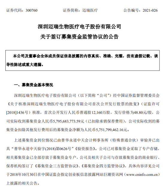 6月29日,迈瑞医疗发布《关于签订募集资金监管协议的公告》,公告提到,公司股东大会审议通过了《关于变更部分募集资金投资项目的议案》,同意公司缩减“营销服务体系升级项目”、“信息系统建设项目”募集资金投入额,将上述项目缩减的募集资金及“研发创新平台升级项目”、“迈瑞南京生物试剂制造中心建设项目”的剩余募集资金投入“武汉研究院项目”的建设。
