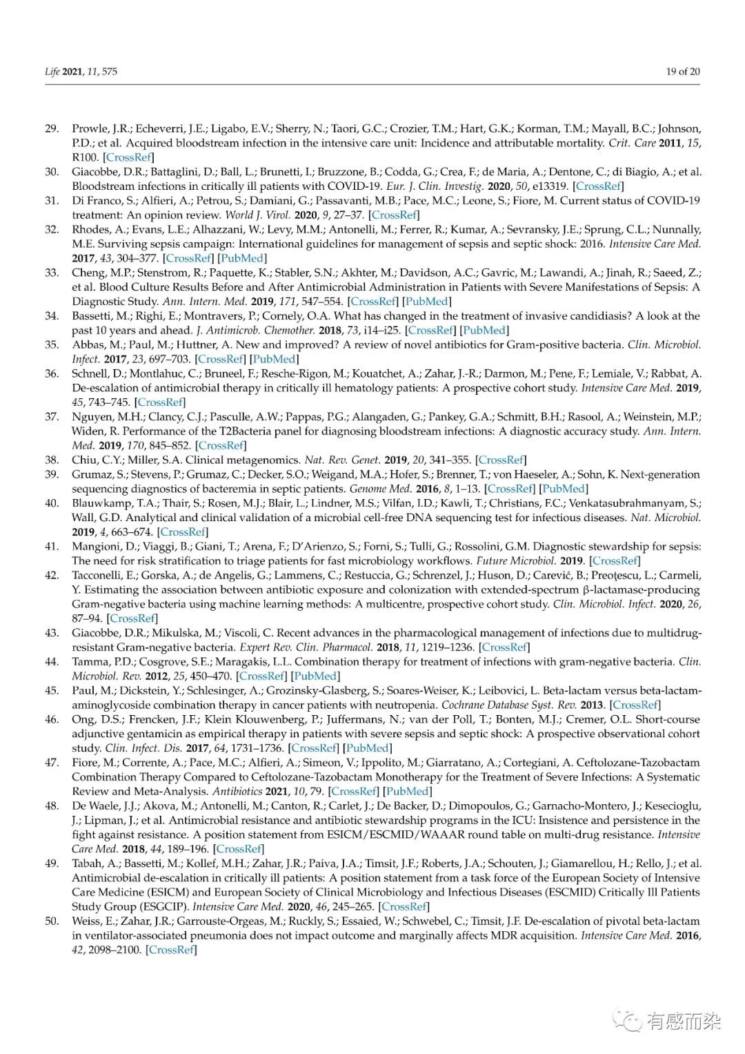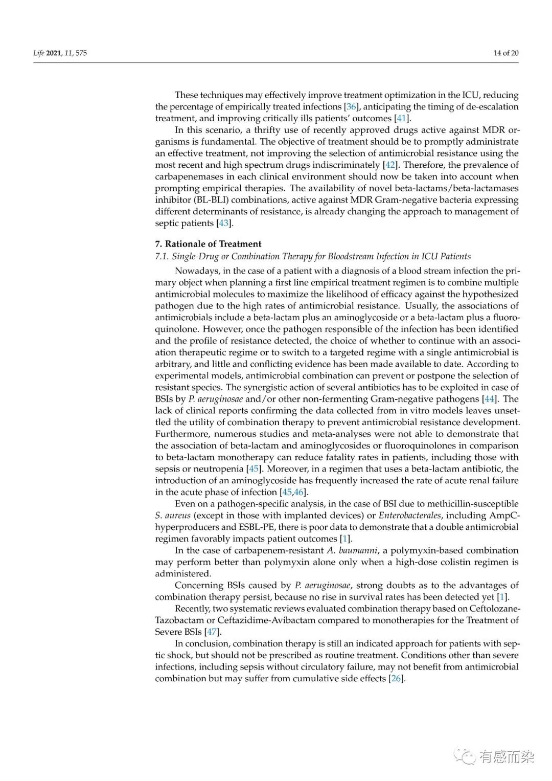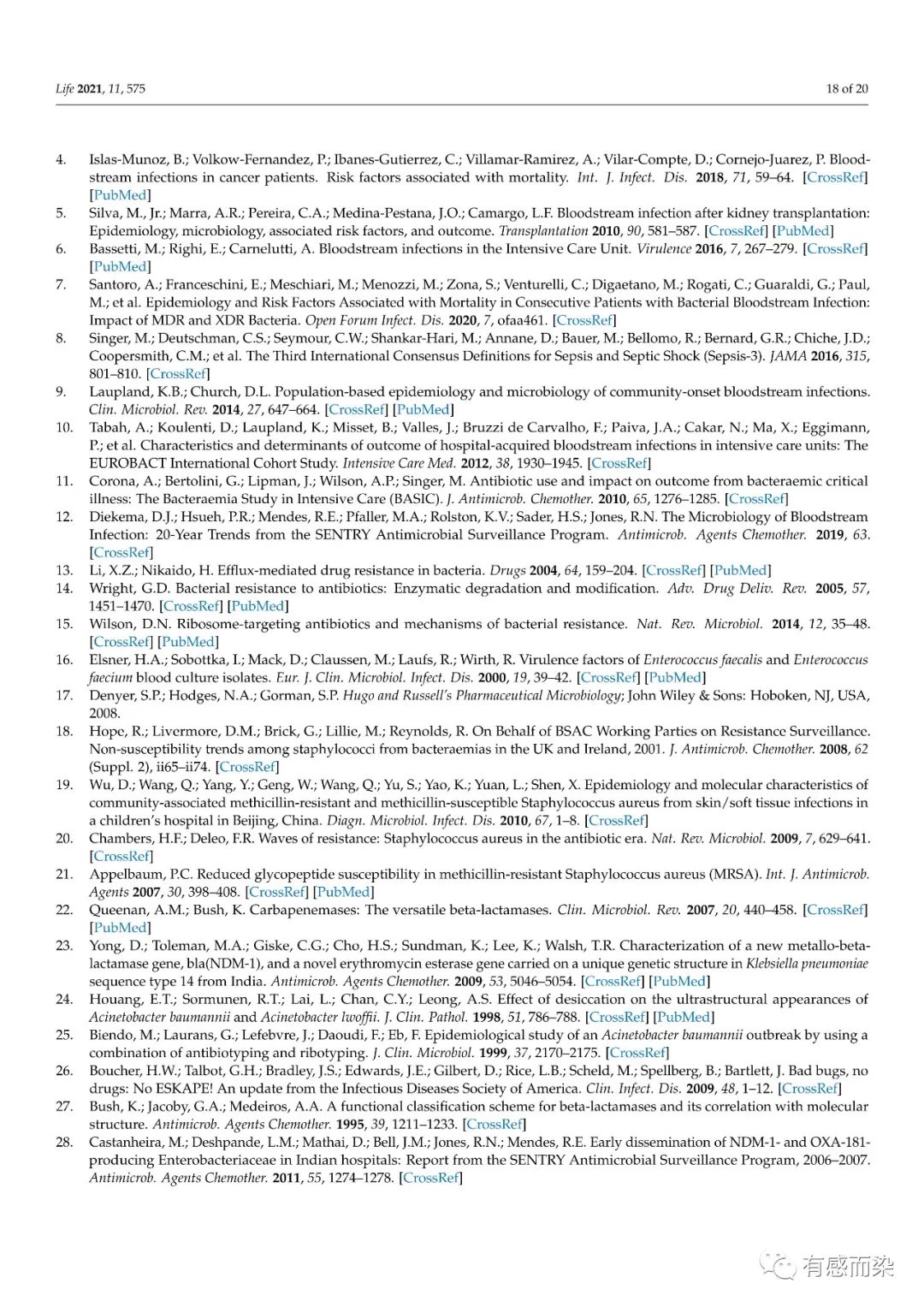 | 2021年6月,Life (Basel)杂志发表了“MDR 细菌引起的血流感染”,题为Blood Stream Infections from MDR Bacteria。背景:血流感染 (BSI) 是全球日益严重的公共卫生问题,是最严重的医院感染之一,被全球认为是导至治疗结果危险、增加治疗成本的重要因素。BSI 是重症监护病房 (ICU) 中最常见的致命疾病之一。在感染性休克、免疫缺陷和延迟治疗的情况下,即使有足够的抗菌治疗和/或源头控制,结果也往往是不可控的。方法: 这篇综述文章总结了 BSI 的流行病学和微生物学特征,特别关注 ICU 获得性 BSI (ICU-BSI),它们通常由多重耐药 (MDR) 病原菌引起。结果: ICU 获得性 BSI 在 5-7% 的 ICU 患者中普遍存在。肺炎克雷伯菌、大肠杆菌、鲍曼不动杆菌和铜绿假单胞菌是最常引起多重耐药感染的病原菌。近年来,耐多药肠杆菌科细菌的发病率从 6.2%(1997-2000)增加到 15.8%(2013-2016)。结论:考虑到血流感染的预防和治疗如今被世界卫生组织视为全球公共卫生问题,我们有义务投入更多资源来解决或减少这些感染的传播,确定BSI高危风险的患者,以保证早期的分子或微生物学诊断,以及在可能的情况下通过使用降阶梯策略更快地进行适当的治疗。https://doi.org/10.3390/life11060575