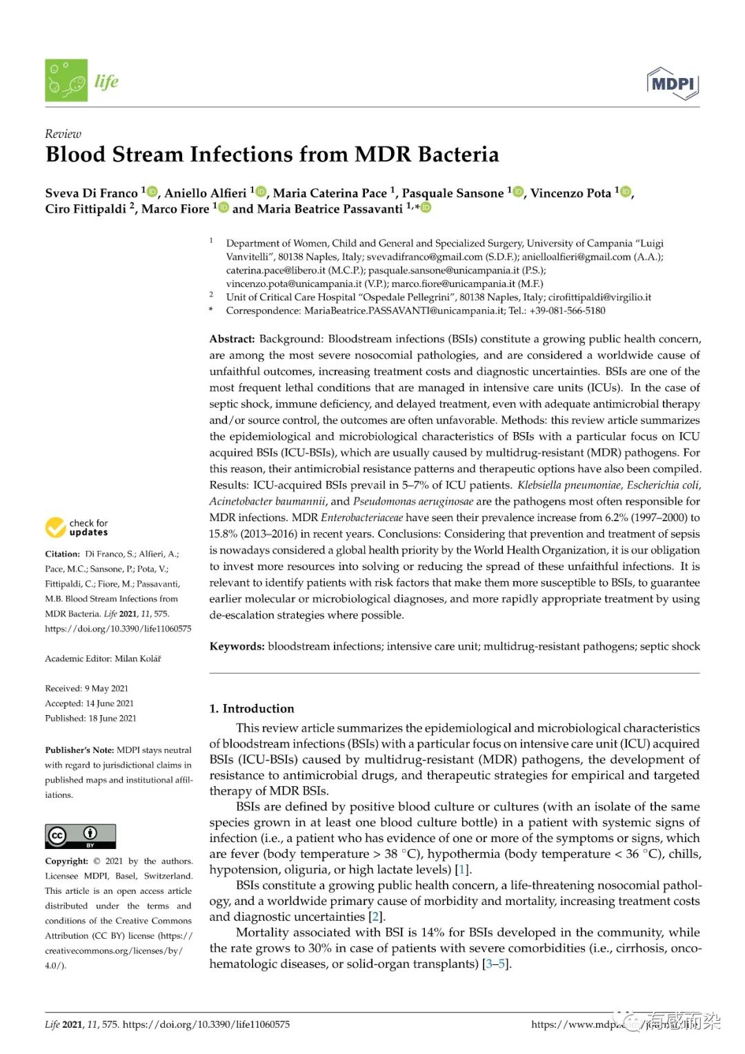 摘要: 2021年6月,Life (Basel)杂志发表了“MDR 细菌引起的血流感染”,题为Blood Stream Infections from MDR Bacteria。背景:血流感染 (BSI) 是全球日益严重的公共卫生问题,是最严重的医院感染之一,被全球认为是导至 ...