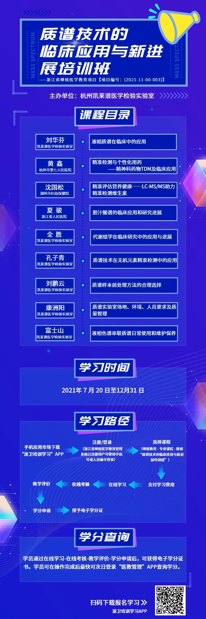 随着“精准医疗”在国内的兴起,质谱技术作为生物样本内小分子分析的金标准方法,是精准诊断实现过程中不可或缺的工具。本期培训班以质谱技术的临床应用和新进展为主题,邀请质谱领域的资深技术专家和临床专家学者分享质谱技术原理以及在临床中的相关应用和进展,旨在推动质谱技术在临床的普及和应用,以期帮助大家更好的了解和使用质谱技术,共同发展质谱的临床应用,服务临床,造福病人。 培训班将采用远程网络方式授课,教学总时数15学时,拟授浙江省级I类继续教育学分5分,欢迎各医院医务人员踊跃参加! 课程详情 证书打印 访问浙江省卫生健康委医学教育信息服务平台—继续医学教育管理—(新)学分管理入口,输入用户名密码登录(可通过单位或科室账户查询,或使用找回账户密码)。点击统计查询中的学分情况查询,可查询个人学分情况。选定学分条目,点击导出学分证书,可导出电子学分证书。 网址:http://zjyxjy.zjwjw.gov.cn 支付信息 课程费通过“浙卫培训学习”APP在线支付。由杭州卓健信息科技股份有限公司收费并开具电子发票。付费成功填写发票信息后,可在“我的”-“我的订单”里或填写的电子发票接收邮箱中下载发票,回原单位报销。 报名亦可联系下方客服人员,开具“培训费”发票,用于单位报销。