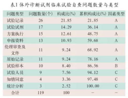 统计试验机构对体外诊断试剂试验项目自查发现问题的数量和问题类型。采用描述性分析方法计算发现问题的构成比及累计构成比,并进行帕累托图分析 [2-3] 。以发现的问题类型为横坐标,问题数量为纵坐标做直方图;以累计构成比为纵坐标做折线图;将直方图和折线图合并,绘制成帕累托图。设定累积构成比≤ 80%为主要因素(A类),>80%而≤90%为次要因素(B类),>90%为一般因素(C类)。结合国家食品药品监督管理总局发布的《体外诊断试剂临床试验技术指导原则》 [4] 和《医疗器械临床试验现场检查要点》 [1] 中的体外诊断试剂临床试验现场检查要点,利用鱼骨图对质量问题情况进行根因分析,找出问题并制定提高试验质量措施。
