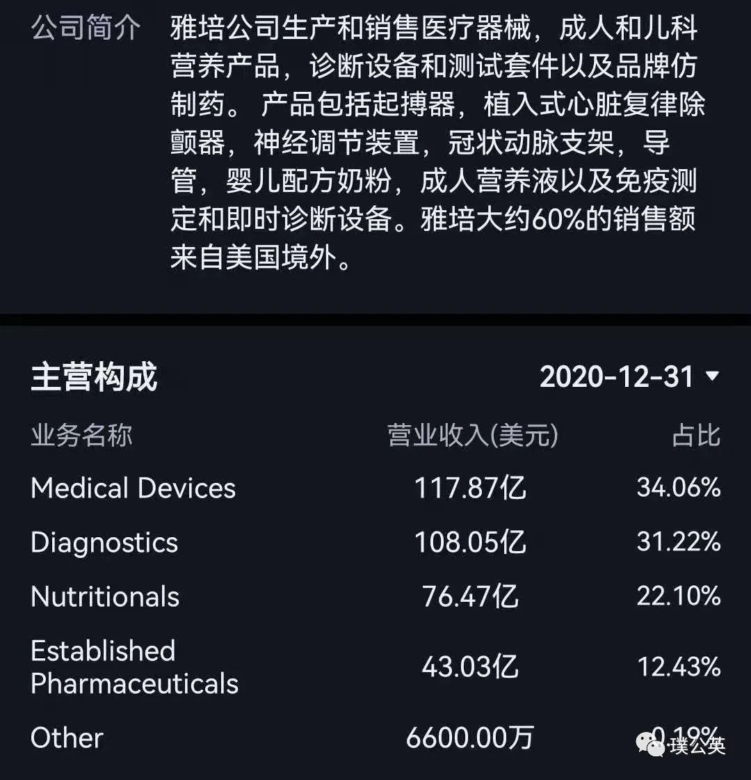 可以理解,雅培系全球医疗健康顶级品牌。但冰冻三尺,非一日之寒。雅培有今日的产业江湖地位,乃是一百多年沉淀和奋斗的结果。一百多年来,雅培的发展历程有起起伏伏,也有波澜壮阔;有创始人奠定的创新传统,也有近代明星CEO英明睿智把企业推向产业之巅之功。 研读一下雅培百年史,对中国正在爬坡的医药和医械企业,应该不无启发。 创世纪(1888-1933):从创始人到上市 雅培公司创立于一个多世纪前的美国芝加哥,其创始人为执业医师——雅培Wallace Calvin Abbott。 雅培医师出生于1857年,于1885年毕业于密歇根大学。可以想象雅培医师是个有创新精神和商业头脑的人,在从医同时,他在芝加哥开了个药店,对药有一定研究。当时,医生给病人开药,往往是液体形式,不好储存、容易变质。为了解决这个问题,有比利时医生发明了固体形式药丸,在芝加哥有售,但品质不够好。雅培医生决定自己做,于1888年成立了雅培药厂,生产固体药丸,这是雅培公司之始! 雅培医师的药厂创业还是比较成功的,第一年,销售额就达到了2000美元。 雅培公司迅速发展,到1894年,雅培生物碱公司(Abbott Alkaloidal Company)成立。此时的雅培医生,除了是企业主之外,也从事出版活动,是医学刊物出版商(当时刊物名称为The Alkaloidal Clinic, 后改名American Journal ofClinical Medicine)。(1894年成立雅培生物碱公司是公司官网说法,也有资料说是1900年成立雅培生物碱公司。) 在此期间,雅培医师表现出灵活的商业头脑,他在向其他医生推销其药物同时,也邀请医生入股雅培公司(不知是否因此导至公司股权相对多元化,在雅培医师去世后让公司管理相对混乱)。公司迅速发展壮大,到1905年时,雅培公司年销售额已达20万美元,是1888年刚成立时的100倍! 处在上升期的美国(内战后的数十年是美国高速发展期),雅培很早就表现出国际视野和扩张意识。早在1907年,雅培就在英国伦敦设立办事处,这是雅培首次将公司业务拓展到美国以外市场。(这是载于公司官网的说法。但估计伦敦办事处实质重要性不高。也有资料提及直到1931年,雅培才真正走出美国,在加拿大蒙特利尔设立分支机构。) 非常值得注意的是,在1915年,雅培公司将公司名字改为“雅培实验室/ Abbott Laboratories”,并将此名字使用至今!这一改名,充分体现了雅培以研发和创新为核心能力导向的公司宗旨,有着巨大意义。中国无数仿制药厂,面对一百多年前美国药企创新标杆,不知是否汗颜?! 20世纪初是化工工业高速发展期,也是化药高速发展期。一战的爆发,更是给美国医药产业提供了发展机遇! 1916年,雅培第一款合成药物Chlorazene投产。这款具有突破意义的抗菌药物,是由英国化学家Henry Dakin博士一战时为治疗受伤士兵而开发的。这款药物应该其他药企也能生产,虽对雅培有意义,但并非雅培专利。 真正提升雅培产业地位的,是在美德敌对、无法得到德国一些独家生产的先进药物的情况下,开发出德国药物的替代品:雅培公司开发出普鲁卡因(Procaine)替代了德国生产的诺瓦卡因(Novocaine),开发出巴比妥(Barbital)成功替代了德国生产的Veneral。普鲁卡因(Procaine)和巴比妥(Barbital)这两款药都有麻醉、镇静等作用,应该被视为雅培进入麻醉药领域的开始。