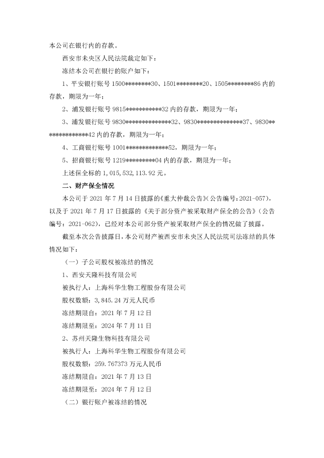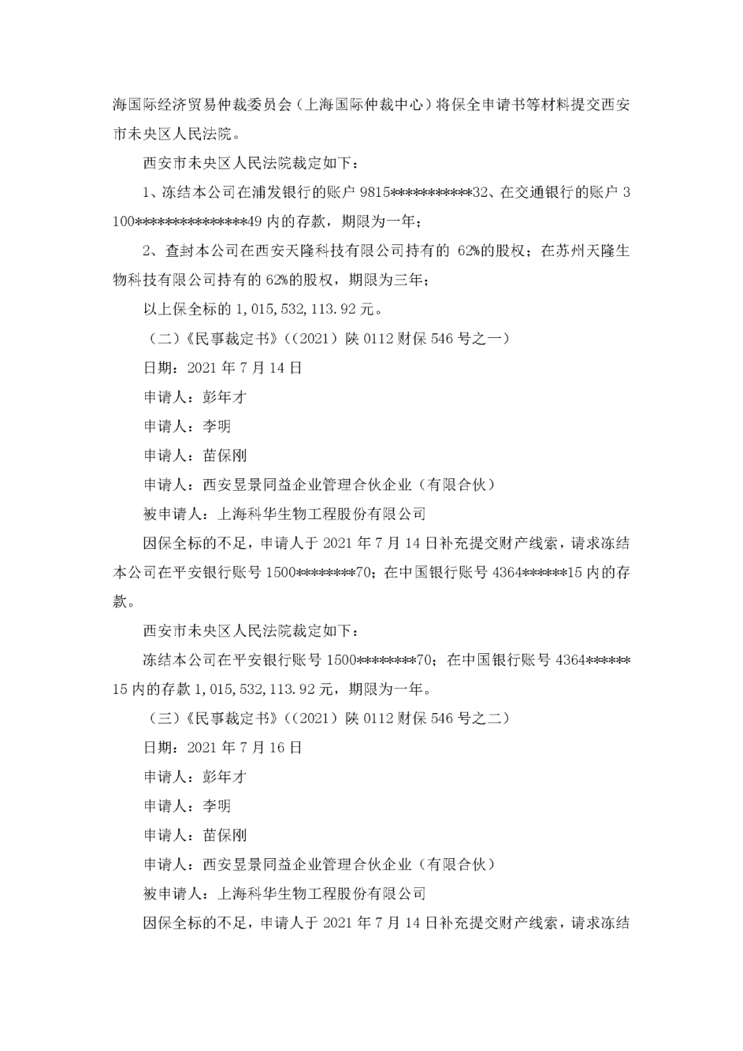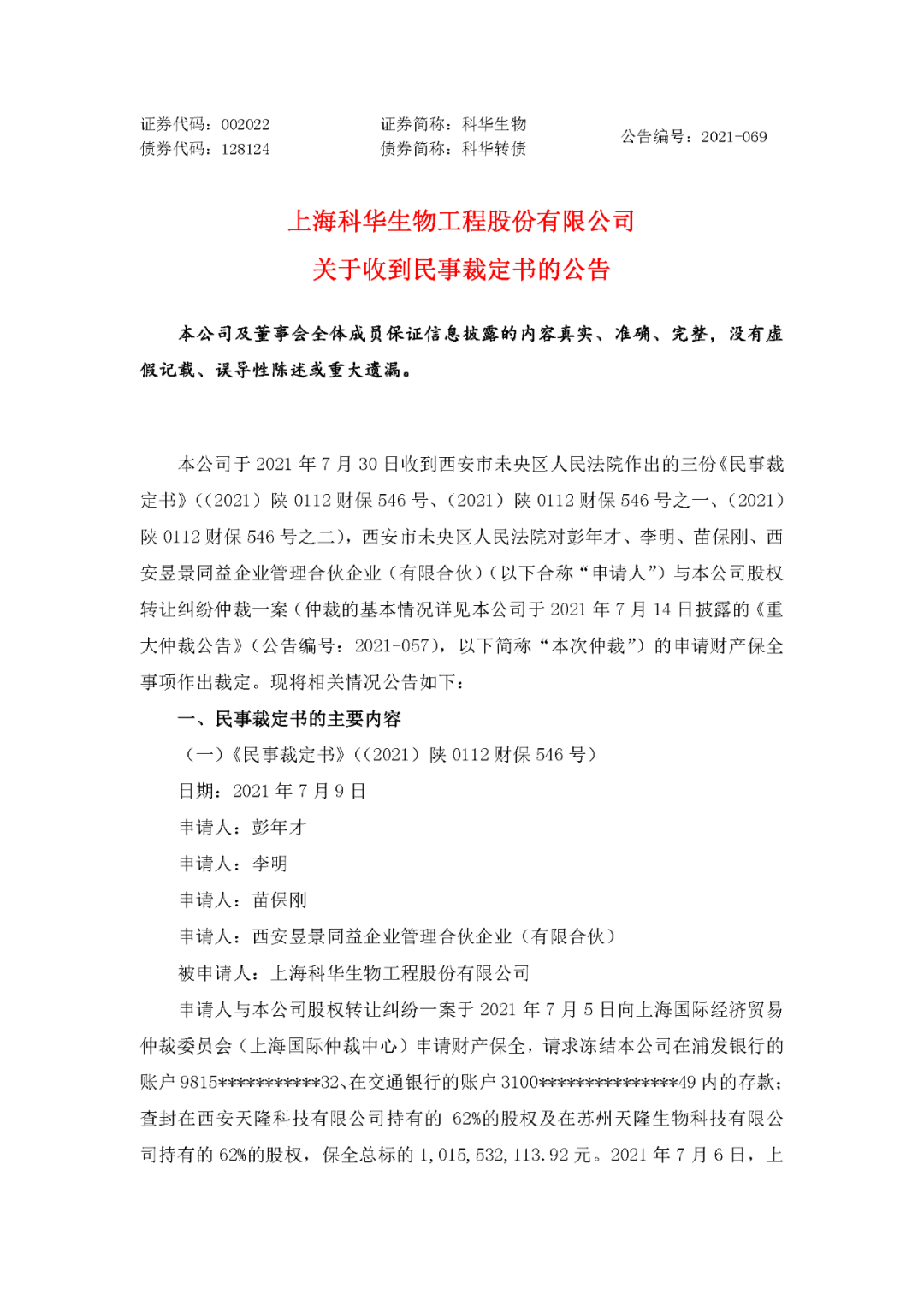 8月3日,科华生物发布公告,披露收到民事裁定书。 针对之前科华与天隆的仲裁事件,大意是天隆股东向上海仲裁委申请财产保全,仲裁委将保全申请书等材料提交西安市未央区人民法院。法院判决冻结科华生物多个银行账户资产一年,查封科华生物在西安天隆和苏州天隆的62%的股权,期限为三年。以上保全标的为1,015,532,113.92 元。 科华生物回应: 1、本公司正在收集整理相关证据材料,积极做好各项仲裁准备工作,并将视需要向上海国际经济贸易仲裁委员会提出仲裁反请求。 2、本公司的日常经营活动正常开展,没有受到本次仲裁通知事件的影响。 3. 本次仲裁尚未开庭审理。本次仲裁对本公司本期利润或期后利润的影响需以仲裁裁决或者调解、和解结果为准,目前尚无法判断。 4.本公司持有的天隆公司股权被冻结。该等股权冻结客观上仅对股权转让事宜产生影响,不会对本公司生产经营造成影响。 5.本公司被冻结银行账户 6 个,被冻结的资金余额共计 38,323,812.13 元,其中被冻结的募集资金余额为 27,430,466.32 元。本公司部分银行账户被冻结的事项暂时不会对本公司生产经营及收支造成重大影响。 6.截至本次公告披露日,本公司已经向西安市未央区人民法院提交书面财产保全异议申请,认为:西安市未央区人民法院的行为已经构成了严重超标的额保全,且西安市未央区人民法院对本公司位于上海的银行账户财产依法不具有采取冻结措施的管辖和执行权;同时,西安市未央区人民法院违法对本公司基本存款账户的冻结亦明显超出必要,损害了本公司的合法权益。基于此,本公司申请要求西安市未央区人民法院变更对本公司持有的天隆公司股权的冻结,并解除对本公司银行账户的冻结。 以下为公告原文: |