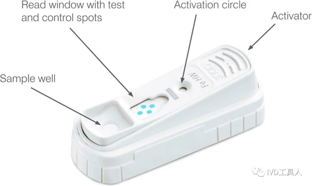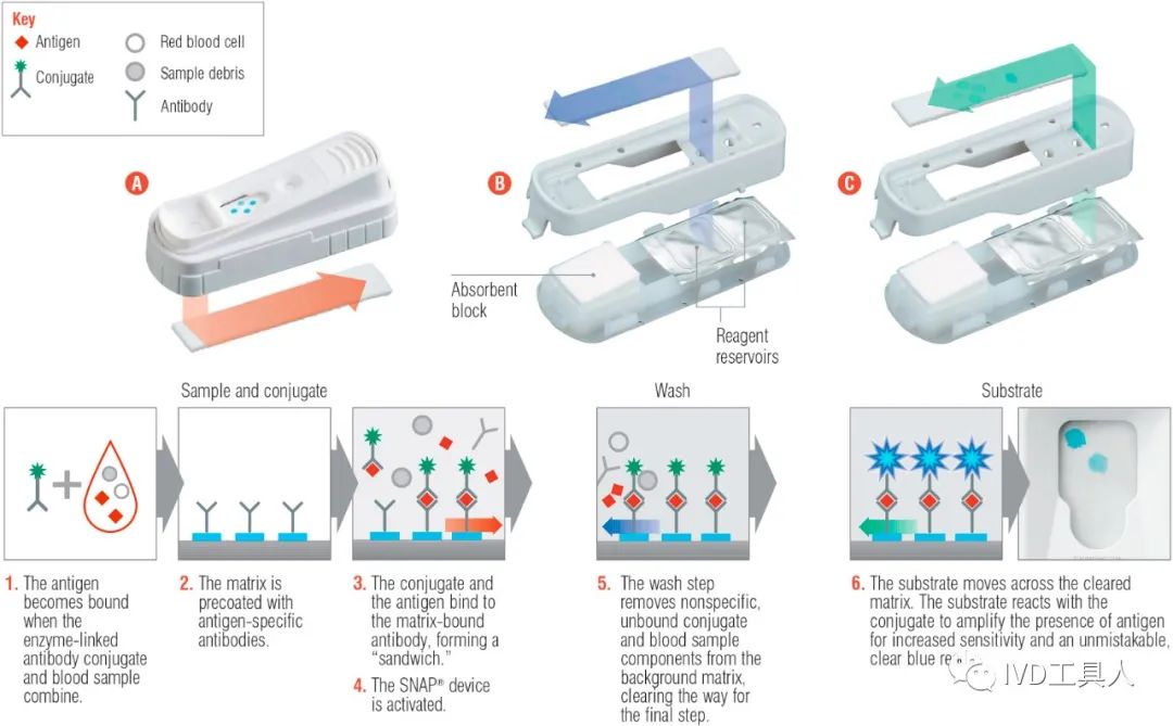 根据这个描述,能推测到,与普通的层析相比,还有一个激活的步骤。 首先,SNAP没有采用胶体金,而是采用HRP催化TMB HRP:辣根过氧化物酶 TMP:3,3', 5,5'-四甲基联苯胺 所以SNAP的试纸上没有金。 过程一 样本(全血,血清,血浆)与标记了HRP的抗体溶液混合,完成HRP-Ab与Ag的反应,形成 Ag-Ab-HRP复合物。 过程二 将混合后的溶液加入上图中的加样孔 过程三 Ag-Ab-HRP复合物,顺着膜网上层析,与膜上的包被的Ab反应,形成Ab-Ag-Ab-HRP复合物 过程四 溶液出现在激活信号孔,于是按下激活扳机。 这里解释下,激活扳机被按下去后,激活扳机下方的两个溶液仓,分别是清洗液仓,TMB溶液仓,分别被刺破,溶液渗出。 在加样孔下方,有一个厚实的吸水垫,本来与试剂条处于隔离状态。当样本溶液进入加样孔,溶液大部分都是往上层析的。 一旦激活扳机被按下之后,这个这个吸水垫就和试剂条直接接触了。于是它开始回吸溶液。 过程五 被刺破的清洗液仓流出的清洗液,顺着试剂条向着加样孔方向流动。在这个过程中,没有被膜上Ab捕获的Ag-Ab-HRP复合物,又有一次机会被抓住。 同时,不停流动的清洗液,也将多余的Ab-HRP,全部吹走。 过程六 同时被刺破的TMB溶液仓,紧随其后,跟着清洗液后面向加样孔流动。TMB流过Ab-Ag-Ab-HRP复合物时,HRP催化TMB,生产蓝色的物质,并且沉淀。形成可观察的斑点。 点评: 老产品,老设计,但是非常经典。IVD工具人推送过的一个微流控ELISA,通过控制各个通道的液体流速来完成清洗,催化底物。异曲同工之妙。 |