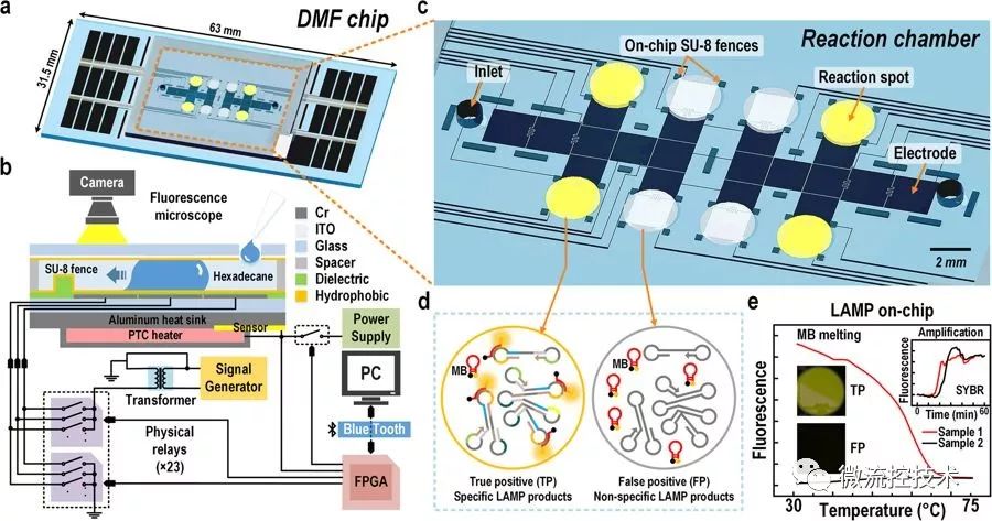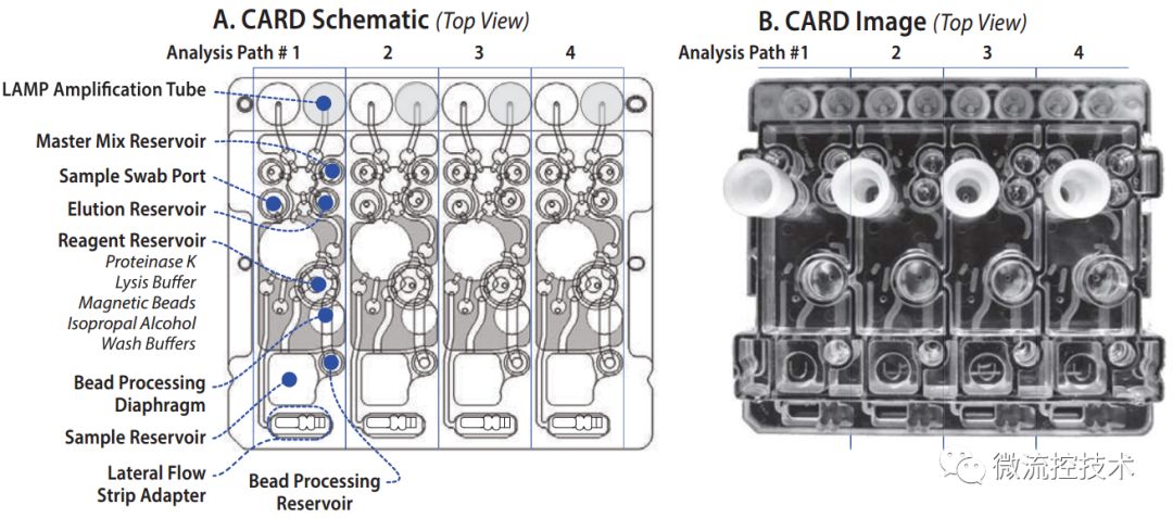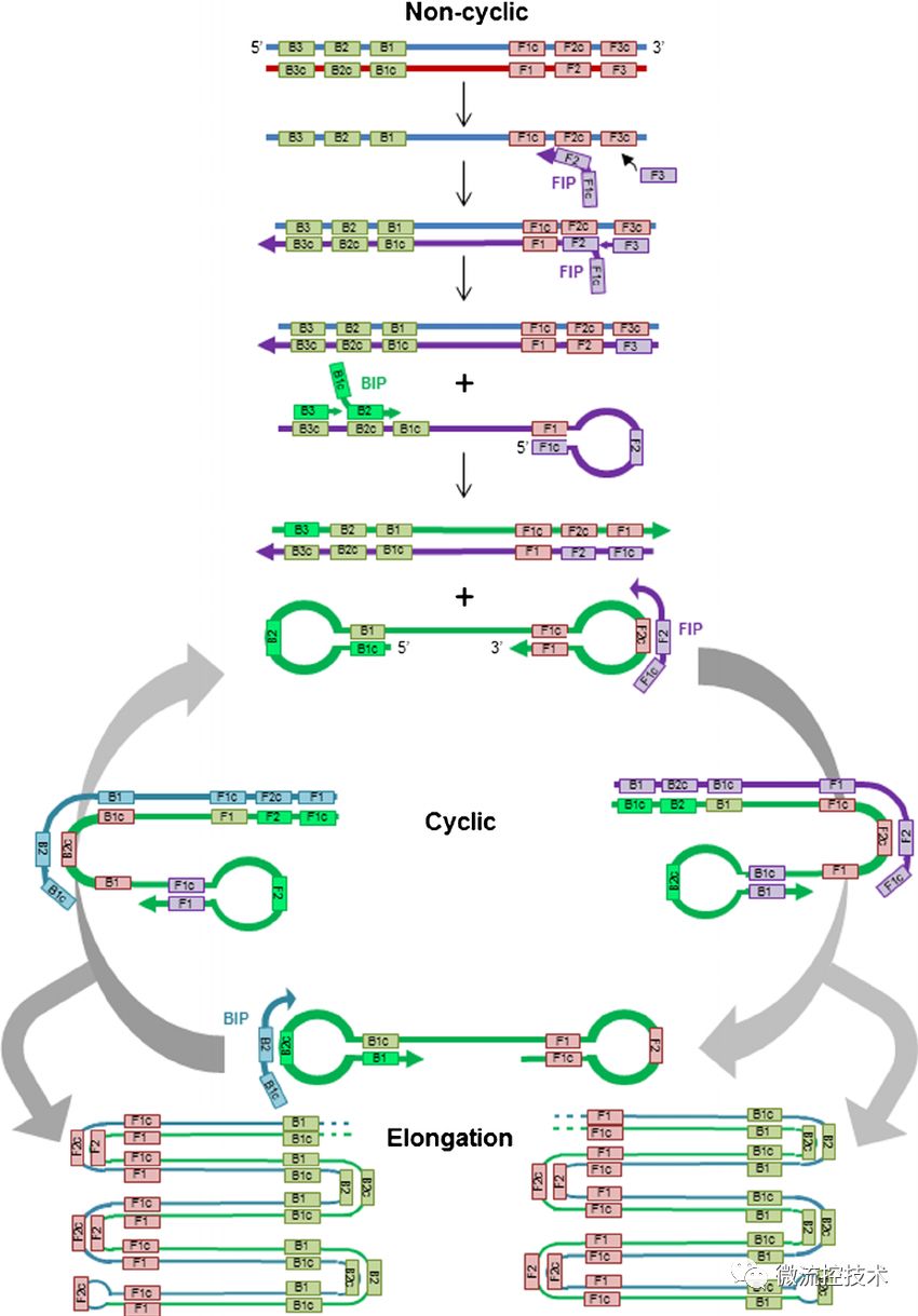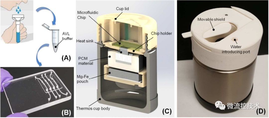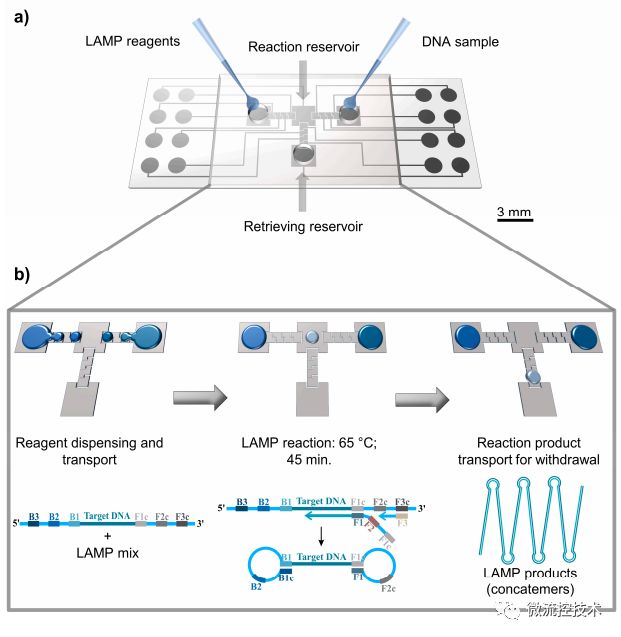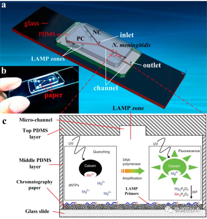 图解环介导等温扩增(LAMP)微流控检测技术 基于微流控芯片的核酸扩增检测系统是微流控技术最具前景的应用方向之一,它简化了核酸扩增检测中繁琐的样品前处理和扩增产物检测步骤。在多种检测方法当中,环介导等温扩增技术(LAMP)与微流控检测技术结合的核酸扩增检测系统非常适合于应用于POCT(床边检测)。根据国内外相关研究报道,环介导等温扩增微流控技术已经应用于检测病原微生物、癌症生物标志物以及其他标志物检测领域。 本文采用【图解】的方式,讲解环介导等温扩增微流控检测技术的原理、分类以及应用。 01 什么是环介导等温扩增 环介导等温扩增技术(Loop-mediated Isothermal Amplification, LAMP)是2000年由日本荣研株式会社的Notomi等人提出的一种新型核酸扩增技术。该技术依靠4-6条特异性引物和一种具有链置换活性的 DNA 聚合酶(Bst DNA聚合酶),在等温条件(60-65℃)下扩增靶序列,避免的传统PCR需要变温扩增而对精密仪器的依赖性,同时具有快速、高效、特异性强的特点。 LAMP原理视频 02 环介导等温扩增微流控检测技术 2004年,Hataoka研究团队设计了一块十字通道的PMMA微流控芯片用于LAMP检测前列腺特异性抗原cDNA。 环介导等温扩增具有操作简便、快捷、高效、特异性等特点,能满足微流控集成诊断系统的要求,实现两种技术的完美结合。同时微流控技术也可以为LAMP核酸检测系统提供形状、大小不同的微量密闭反应通道及微反应空间,有效克服了LAMP易产生气溶胶,造成实验污染的弊端。微流控技术可提供平行且互不干扰地微反应区,可以构成多通道环介导等温扩增诊断集成系统。 03 环介导等温扩增微流控技术分类 04 碟式LAMP微流控检测技术 周杰等采用北京博奥晶典生物技术有限公司RTisochip-A 恒温扩增微流控芯片分析仪,基于环介导恒温扩增技术对转基因农作物样品中靶标基因进行检测。该碟式芯片共有24个样品检测孔,每个孔体积为2.2uL。检测时间为30min,该检测试剂可以大大缩短检测时间和降低检测成本。 Abkar Ahmed Sayad 等开发出一种碟式离心型微流控装置。该装置分为三层,底部PMMA层,中间压敏胶(PSA)粘合层和底部PMMA层。微流控通道通过切刻机在底层制作出混合试剂、测量、 等温扩增和检测的微流控腔室。LAMP 实验的排气和装载孔、蜡、密封材料放在微流控 CD 顶层。该系统,对添加沙门氏菌的番茄进行检测,检出限为 5×10-3 ng/uL。整个过程,从样品制备到检测,可以70min内在微流控 CD 上全自动化完成。 Zhou等运用碟式离心聚甲基丙烯酸甲酯(PMMA)芯片荧光 LAMP 检测法,成功实现了一类弧菌的芯片 LAMP 快速检测,检测时间仅用30min,芯片LAMP扩增较之常规LAMP扩增,具有操作简便,扩增速度快,便于携带,实时快速等优点,相对于常规LAMP 检测法耗材量大大降低。 05 卡式LAMP微流控检测技术 美国Rheonix公司开发的基于微流控技术的 CARD 芯片,该芯片集成泵、阀门、微通道、反应和试剂储液池,以及通用DNA阵列。CARD芯片采用聚苯乙烯均聚物注塑而成,可以用于免疫检测和核酸检测。Chen 等可在60min内,使用 CARD 芯片提取人类免疫缺陷病毒(HIV)RNA ,20min内完成进行 RT-LAMP 检测,分析灵敏度可达每毫升 103 病毒颗粒(103vp/mL)。此外,台式 RT-LAMP 和 CARD 芯片上的分析结果显示加入病毒与结果CT值的一致性,说明CARD芯片具有与劳动密集型的台式LAMP同样的处理能力。 Dou等研发了一种PDMS-纸混合微流控装置,PDMS不用复杂的表面处理,无大型设备,将“纸”的技术引入到微流控LAMP装置中。该装置包括三层,两个PDMS层和一个玻璃载片底层。首层PDMS用于试剂递送,包含三个微通道和一个加样入口。中间PDMS层由底部的6个孔道组成,作为LAMP反应区。底层为用于支撑的玻璃载片。该装置可以在45min内检测最低为3个拷贝的脑膜炎奈瑟氏球菌。 06 数字式LAMP微流控检测技术 Coelho等设计了一种T型数字微流控芯片,使用数字微流控与LAMP结合的技术扩增癌基因c-myc 0.5 ng/uL靶标DNA只需45min,反应液仅需1.54ul,远远低于台式反应技术。 Wan等为了进一步加强LAMP反应的特异性,开发了一种使用分子信使DNA探针的病原体数值微流控系统。该系统仅需1uL的LAMP反应样品。可以在40min内检测最低10个拷贝。该检测速度比传统商品定量PCR设备的快3倍。并且有效解决LAMP假阳性问题,区分特异性反应产物和非特异性反应产物。 07 集成式LAMP微流控检测技术 Song等研制了一种简单易于操作,价格低廉,POCT集成式,RT-LAMP微流控芯片装置,可用于寨卡病毒检测。该装置在杯盖抽屉内集成了镁-铁反应的热源,来控制LAMP反应温度。一次性微流控芯片完成病毒核酸的捕获、浓缩、提纯、等温扩增和检测。扩增产物的检测不需要额外的仪器,采用无色结晶紫染料进行目测。整个装置可以在40min内完成口腔样本中寨卡病毒灵敏度5个单位。 08 LAMP微流控检测技术展望 本文介绍了四种类型的LAMP微流控检测技术,虽然微流控结构大不相同,但是均集成了LAMP技术和微流控技术的优势,特异性强、灵敏度高、样品消耗少、节省时间、检测高效和操作简便。应用领域涉及,疾病监测和管理、病原体鉴定、环境监测、流行病学调查及遗传病的检测。因此,相信随着这项技术的不断完善,不久将来,LAMP微流控检测技术的产品会相继进入市场,为人类生命健康发展和生态环境保护起到重要的推进作用。 参考文献: 殷宏, 汤小玉, 薛强, 等. 检验检疫学