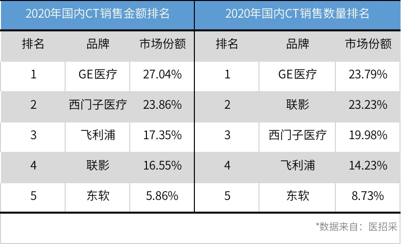 相比GPS动辄在华几十亿美元的年销售额,老牌国产企业东软医疗,2020全年营收仅为24.59亿元人民币。 集采之下,对于外资巨头雄踞的乙类设备领地,相当于一次给国产的天然福利! 根据医招采数据,以CT产品为例 从销售金额来看