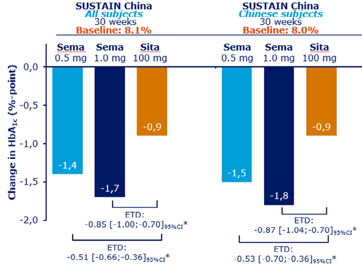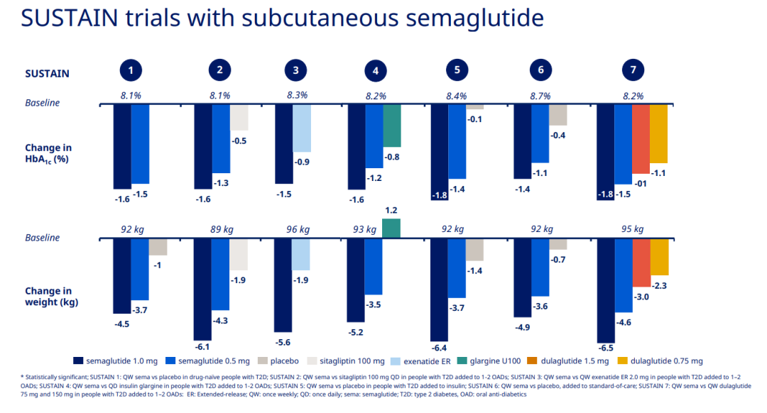 命名为SUSTAIN的一系列III期临床试验成功证明了每周1次皮下注射司美格鲁肽相比各种临床常用的标准降糖疗法在降低血糖和减轻体重方面的显著优势,包括SUSTAIN 2(司美格鲁肽 vs 西格列汀)、SUSTAIN 3(司美格鲁肽 vs 艾塞那肽周制剂)、SUSTAIN 4(司美格鲁肽 vs 甘精胰岛素)、SUSTAIN 5(司美格鲁肽+背景降糖治疗vs 安慰剂+背景降糖疗法)、SUSTAIN 7(司美鲁肽 vs 度拉糖肽)等。 针对中国 2型糖尿病患者的III期SUSTAIN CHINA研究也证明了中国人群中,司美格鲁肽在血糖控制方面相比西格列汀的显著优势,HbA1c水平降幅达1.8%,HbA1c达标率(<7.0%)高达86.1%,且低血糖发生率极低。