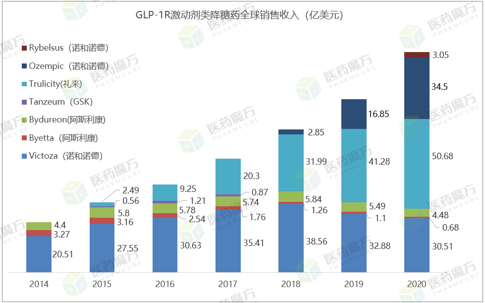 GLP-1药物在10年前并不像如今这样受重视,但是随着越来越多的临床研究结果公布和心血管获益证据持续被发现,这类药物非常契合糖尿病综合管理的需求,临床治疗地位日渐攀升,同时也让糖尿病的治疗理念从单纯的血糖达标演变为兼顾控糖和心血管获益,这一点在糖尿病临床指南更新上也都有体现,并且深刻影响了糖尿病新药的开发。GLP-1类药物由于具有控糖和心血管结局双重获益,在糖尿病药物市场的规模和份额也一路走高,如今成为仅次于胰岛素的第二大类降糖药。