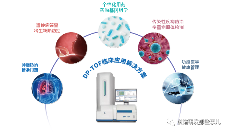 2021年3月,浙江迪谱诊断技术有限公司(迪安诊断参股公司)推出了DP-TOF飞行时间质谱产品,DP-TOF完美整合了PCR技术的高灵敏度、芯片技术的高通量、质谱技术的高精确度和计算机智能分析的强大功能,从而为市场提供了一个覆盖多个应用领域,具有显著成本优势、简易工作流程和高样本通量的全自动解决方案。DP-TOF基于基质辅助激光解析电离飞行时间质谱(MALDI-TOF MS)技术,与配套试剂用于对生命体来源(如血液、体液、组织)样本中已知核苷酸的检测。应用范围覆盖生物学的各个领域,如感染性疾病防控、遗传病检测(出生缺陷防控)、药物基因组学(精准用药)、癌症分析实体瘤和液体活检(肿瘤防控)、健康管理(功能医学)、临床转化医学研究等。