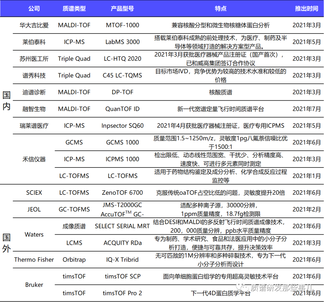 参考资料: [1]https://www.antpedia.com/instrument/77829/[2]http://www.labtechgroup.com/index.php?optionid=968&auto_id=881[3]http://www.labtechgroup.com/index.php?optionid=968&auto_id=887[4]https://news.bioon.com/article/6785773.html[5]https://www.163.com/dy/article/G63B1NB805118K9D.html[6]http://www.each-reach.com/platforms-solutions-menu-zh/solution-menu-zh/10-production-quanid[7]https://sd.dzwww.com/sdnews/202107/t20210702_8716564.htm[8]https://www.iivd.net/article-25240-1.html[9]https://www.antpedia.com/news/91/n-2571991.html[10]http://www.tofms.net/goods/index.html?classid=3[11]https://www.instrument.com.cn/news/20210601/581678.shtml[12]https://www.antpedia.com/news/53/n-2561353.html[13]https://analyticalscience.wiley.com/do/10.1002/was.0110297[14]https://www.jeol.co.jp/en/products/detail/JMS-T2000GC.html[15]https://zhuanlan.zhihu.com/p/381233401[16]https://www.businesswire.com/news/home/20210310005584/zh-CN/[17]https://www.thermofisher.cn/cn/zh/home/industrial/mass-spectrometry/liquid-chromatography-mass-spectrometry-lc-ms/liquid-chromatography-mass-spectrometry-lc-ms-IQ-X.html[18]https://www.bruker.com/en/news-and-events/news/2021/bruker-launches-timstof-scp-for-unbiased-single-cell-4d-proteomics-and-next-gen-timstof-pro-2.html |