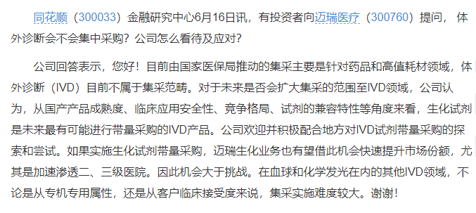 本次集采采用的是谈判议价,先由专家设定入围价格,入围企业再经过两轮谈判最后定价,价格要包含税费和配送费。厂家接受所有产品入围价,且需具备集采的所有5类23项产品。 高景气度的化学发光赛道 化学发光是医疗器械高景气度赛道之一,进口替代空间大。2019年中国化学(5.78 -0.86%,诊股)发光市场约为300-350亿,行业增速约为15%-20%,目前国产占比约为18%,是体外诊断行业单产品容量大、高速增长的景气赛道之一,目前国产最大发光公司在中国市占率约为3%,空间较大。 最早的化学发光国产产品于2010年上市,经过10年的发展,目前已经有多家优质公司推出了发光产品,在市场上历练。通过国内企业的共同努力,产品相较10年前有了非常大的进步,由于信息流动和资源流动效率提升,产品研发周期相对以前的血球、生化等产品在缩短,目前来看,国内企业在部分项目上具有完全替代的能力,比如传染病,而其他领域的逐步替代将持续进行。代表企业有安图生物、迈克生物、迈瑞医疗。 始料未及的迈瑞医疗 迈瑞公司是国内器械龙头企业,营收规模超过百亿,经过20多年发展,形成了生命信息支持、体外诊断和医学影像等三大业务,监护仪和彩超等多个产品排名全球前列;公司通过并购延伸器械产业链,整合新产品,消化吸收国际先进技术,产品高端化发展。 目前化学发光试剂是迈瑞最高增长的产品线之一,迈瑞在过去两个月中股价多次下调,从最高峰的6000亿跌到了目前的3380亿。 医药股对政策相当敏感,由于集采的原因过去的三个月,迈瑞等医疗器械企业股价下跌厉害。 6月16日,就有投资者在网上向迈瑞医疗提问,体外诊断会不会集中采购?公司怎么看待及应对? 当时公司回答表示:目前由国家医保局推动的集采主要是针对药品和高值耗材领域,体外诊断(IVD)目前不属于集采范畴。在血球和化学发光在内的其他IVD领域,不论是从专机专用属性,还是从客户临床接受度来说,集采实施难度较大。 8月4日,迈瑞医药的股民针对其股价大跌的情况向迈瑞医疗董秘发问,董秘并未正面回答股价暴跌的原因,称公司经营状况一切正常。安徽省集采产品与迈瑞医疗产品无关,公司不受其影响。迈瑞积极参与了深圳市药械集采,且公司产品在当地的市占率有所提升。并且目前由国家医保局推动的集采主要是针对药品和高值耗材领域,公司的三大业务线的产品均不涉及药品和高值耗材,其他产品当中的骨科耗材,因为收入占比极小,因此目前对公司业务基本没有影响。如从未来潜在影响的角度分析,医疗设备作为医院的成本项、而非收入项,医院是自然的控费降本实施主体,因此医疗设备并不属于国家医保局实施集采的对象。 想不到化学发光试剂集采这就应声而来! 二级市场对集采做出了强烈反应。迈瑞的股价也创下了14个月的新低。 IVD行业变向何方?