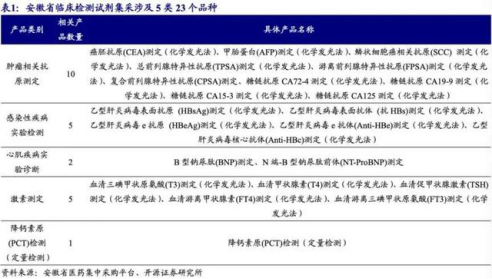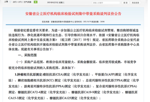 8月19日,安徽省医药集中采购服务中心官网发布《安徽省公立医疗机构临床检验试剂集中带量采购谈判议价公告》(简称《公告》),拟对部分临床用量较大、采购金额较高、临床使用较成熟、市场竞争较充分的临床检验试剂进行集采,主要涉及肿瘤相关抗原测定、感染性疾病实验检测、心肌疾病实验诊断、激素测定、降钙素原(PCT)检测(定量检测)这五类化学发光试剂产品。