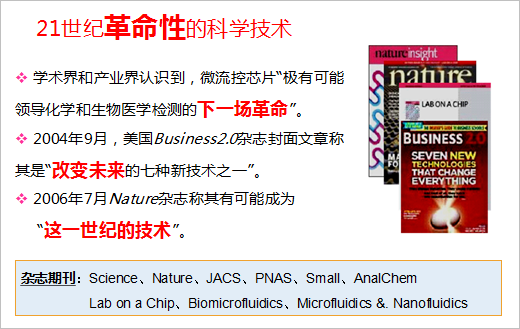 (二)微流控芯片的战略意义 自微流控芯片诞生以来,一直受到学术界和产业界的极大关注。2001年,“Lab on a Chip”杂志创刊,它很快成为本领域的一种主流刊物,引领世界范围微流控芯片研究的深入开展。2004年美国Business 2.0杂志在一篇封面文章把芯片实验室列为“改变未来的七种技术之一”。2006年7月Nature杂志发表了一期题为“芯片实验室”专辑,从不同角度阐述了芯片实验室的研究历史、现状和应用前景,并在编辑部的社评中指出:芯片实验室可能成为“这一世纪的技术”。至此,芯片实验室所显示的战略性意义,已在更高层面和更大范围内被学术界和产业界所认同。