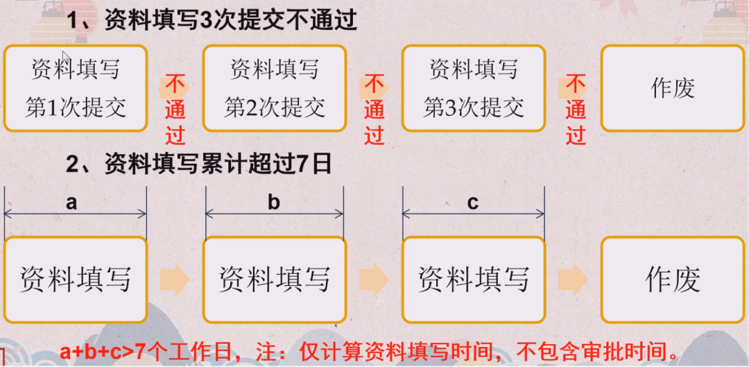 为缩短受理时限,提高受理效率,资料填写3次提交不通过或资料填写累计超过7日,系统将自动作废。进入内部审核阶段的任务增加1次整改次数,即内部审核任务可提交4次。 |