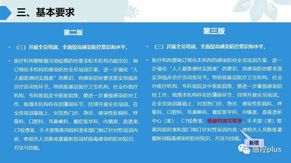 9月13日,国家卫健委官方网站发布《医疗机构内新型冠状病毒感染预防与控制技术指南(第三版)》。 9月13日,国家卫健委官方网站发布《医疗机构内新型冠状病毒感染预防与控制技术指南(第三版)》(点击文末“阅读原文”即可跳转)。 第三版如何培训,且与第二版相比有哪些变化?分享培训PPT: