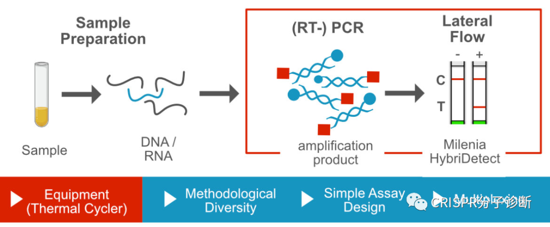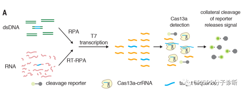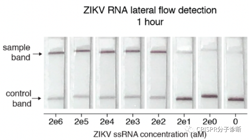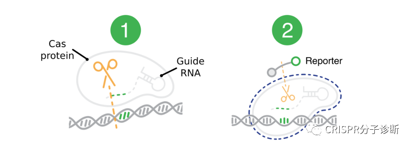 CRISPR诊断被称为下一代分子诊断技术,美国FDA和中国NMPA都颁发过CRISPR诊断平台的新冠诊断EUA授权,而前几天上海伯杰医疗“恒温CRISPR法新冠快检试剂盒”获批的消息无疑进一步激发了大家对CRISPR诊断的热情。CRISPR诊断主要包含样本前处理(含预扩增)、靶标识别、信号释放和检测几部分。本文将主要介绍CRISPR诊断方法所采用的信号报告系统,主要是荧光淬灭、侧向层析和电化学三种方法(相关的内容,James Collins和张锋团队于今年7月发表于Nature Biomedical Engineering的综述文章中有过简单介绍1)。 CRISPR技术被用于分子诊断主要因为特异性:在向导RNA的引导下,CRISPR-Cas蛋白识别靶标序列的特异性极佳,甚至可以精确区分单碱基差异。另外,Cas蛋白接触靶标序列后会被激活出无差别的反式切割活性,无差别的一阵刀光剑影,将周围一切可切割的核酸序列高效切割,从而起到放大信号的作用。同时具备特异性识别和无差别切割特征的CRISPR诊断系统简直就是一把装着瞄准器的霰弹枪。 图1. Cas蛋白识别和切割靶标序列的示意图。图片摘自猛犸生物的官方网站。Cas蛋白通过向导RNA特异性识别并结合靶标序列(对于dsDNA靶标,则需要PAM序列),形成三元复合物,在顺式切割靶标序列的同时也激发出反式切割活性,将周围的核酸序列进行无差别的切割。目前,鉴定的有顺式和反式切割活性的Cas蛋白主要集中在Cas12和Cas13两类蛋白,分别识别(/切割)DNA序列和RNA序列。 由于Cas蛋白只有在特异地识别和结合靶标序列后才切割周围的核酸序列,因此通过检测报告序列是否被切割就可以判定待检体系中是否存在靶标序列。几乎所有的CRISPR诊断方法都通过向体系中加入某些可被检测的外源探针来完成诊断的流程。首次利用CRISPR进行靶标核酸检测的时间应该可以追溯到2016年,Jennifer团队在Nature上发表了Cas13a反式切割活性鉴定的工作,并首次利用Cas13a反式切割活性来切碎荧光淬灭探针,使得探针不被淬灭并发光,从而完成了对靶标RNA的检测2。到了2017年,张锋团队和James Collins团队合作开发了SHERLOCK诊断方法,也是利用了Cas13的反式切割活性3:通过在体系中加入外源的单链报告探针,探针两端分别标记荧光基团和淬灭基团修饰。当探针被Cas蛋白切断,淬灭基团和荧光基团分离导至荧光淬灭失效,荧光基团恢复活性。相比于Jennifer的工作,SHERLOCK引入了靶标扩增的环节,从而将检测灵敏度提高到了aM级别,使得CRISPR诊断真正具备了实用价值。图2. CRISPR诊断荧光淬灭法的信号示意图。图片摘自SHERLOCK系统3在此之后,几乎所有CRISPR分子诊断方法都在检测体系中加入了外源报告探针,并逐渐形成了不同的信号检测系统。其中,荧光淬灭法是一种技术成熟且已经被广泛用作分子诊断的信号报告系统,用于CRISPR诊断时不需要任何新的设计,几乎算是无缝衔接。然而在应用上,荧光淬灭属于液相体系,如果想在同一管内做多重检测的话还是比较费劲的,也需要多色荧光设备,所以今年Jennifer团队开发的免扩增检测新冠的FINTD-IT系统就采用的是双管法,每管还是只检测一个靶标4。电化学传感器法也能和CRISPR诊断系统进行无缝衔接,最直接的方式是用探针将电化学活性物质偶联到电极上,产生较强的电信号响应。由于探针被切割后会使活性物质脱离电极,信号响应降低,故可以通过信号响应的变化来进行诊断。图3. 基于CRISPR和电化学原理的E-CRISPR系统5。 还有一种思路是对偶联到电极的探针本身在切割前后在电极上的固化量差异进行检测,比如在切割反应结束后,通过银增强的方法将银离子固化到探针表面来增强电极信号。探针被切割后信号会减弱,通过这个方式来确定探针是否被切割7。总之,基于CRISPR的电化学的方法有非常多的系统,有兴趣的话,可以阅读之前的文章(CRISPR电化学文章之1,2,3,4,5,6,7)。当大家都在荧光淬灭的路上狂奔时,张峰团队推出了SHERLOCKv2,引入核酸试纸条作为信号报告系统,非常便于POCT使用8。他们在探针的两端分别引入两个小分子标记物FAM和生物素。而他们使用的商品化核酸试纸条将抗FAM抗体用胶体金标记,NC膜上检测线处包被有可结合生物素的链霉亲和素,这种试纸条的原本用途是通过夹心法检测同时含有FAM和生物素的核酸扩增产物。张锋团队则开创性地改变了试纸条本身的判读方式,将这种夹心法试纸条的质控线作为检测线来检测探针是否被切割。他们调整探针浓度,保证在探针未被切割时,所有胶体金都集中在下面那条线,而一旦探针被切割,就会有胶体金越过下面的线到达上面的线显色。 图4. 侧向流层析试纸条工作原理。图片摘自Milenia公司官网。该试纸条开发的最初用途是检测同时含有FAM和Biotin的产品(如上图),在张锋开发出其CRISPR用途后,Milenia公司也在官网展示了其CRISPR诊断方向的用途。图5. CRISPR诊断侧向层析法的工作原理。图片摘自SHERLOCKv2系统8 将这种夹心法的试纸条通过竞争法方式进行判读的设计,非常巧妙。好处在于摆脱对仪器的依赖,可以更好地走向POCT。前段时间James Collins团队开发的、火爆全网的、可以检测新冠的口罩系统,也是采用这种方式9。图6. CRISPR诊断侧向层析法的结果解读。图片摘自SHERLOCKv2系统9。如上图最右条检测条带所示,在检测阴性样本时,也会出现淡淡的T线,从而会给检测结果的判读带来困扰。 以上介绍的三类是基本的方法,此外还有很多调整或者混合使用的方