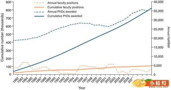 其一,近几年来美国大学培养了大量的博士,然而并没有产生足够的岗位来消化这些高科技生产力;其二,美国国家健康中心(NIH)在1998年-2003年前后经历了一段高速发展时期,研究经费大幅增加,在这段时间中NIH不断大力推动生命科学研究,造成了生命科学研究领域过度繁荣的假象,因此当美国政府开始控制相关经费时,这种就业市场的泡沫破碎也就在预料之中;其三,以生命科学为代表的STEM学科博士专业性质决定这一群体的工作性质很难有长期性,同时也与政府或企业经费多寡有很大关系。因此PhD在就业市场上的尴尬位置也就不难理解。