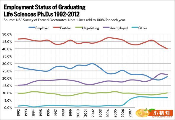 文章中特别指出了这一问题最为明显的生命科学领域。生命科学包括生物医药、健康科学和农业等领域。调查发现,在最近二十年中,从事博士后工作的生命科学博士呈现出一个稳中有升的态势,然而其他受雇比例却略有下降。如果我们考虑到博士后工作的临时性以及相对较低的报酬,这一结果是很难被人接受的。