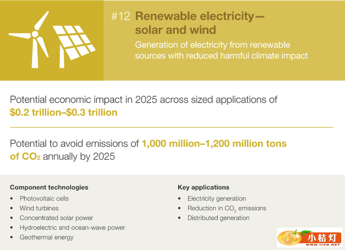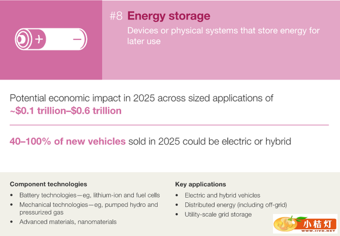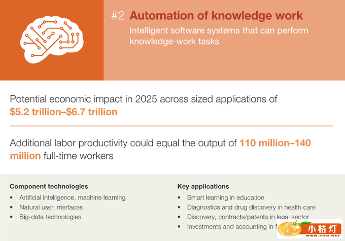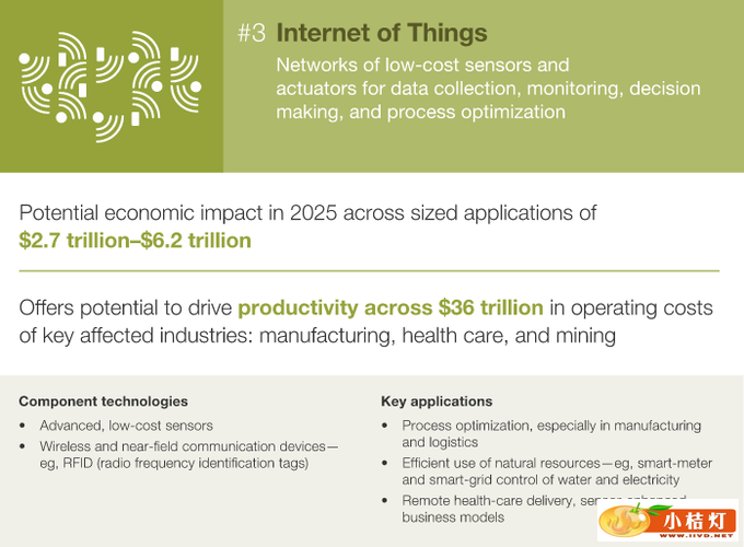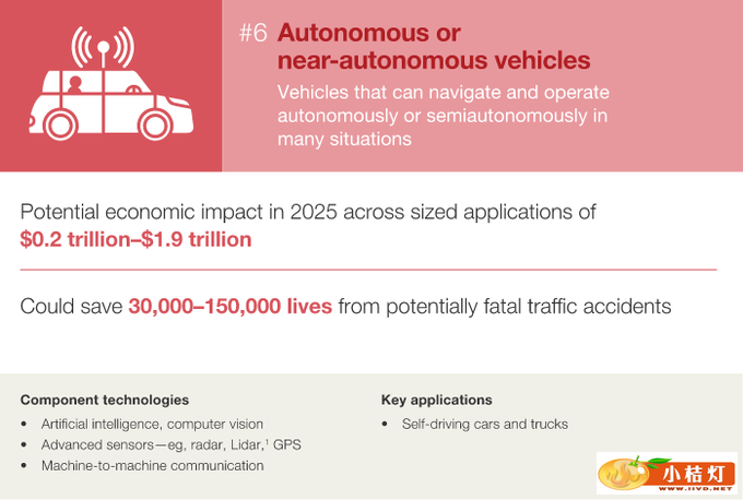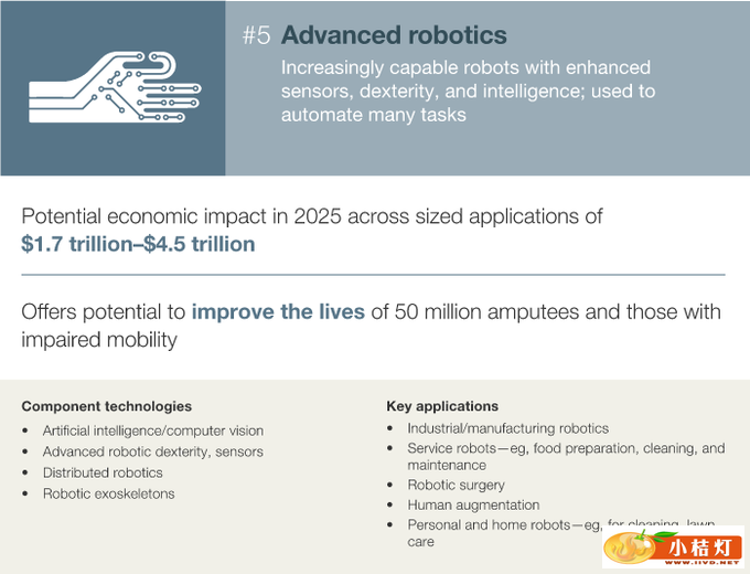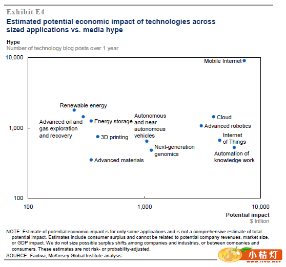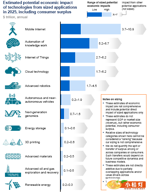 | 麦肯锡发布了一项报告,里面研究了技术对未来经济影响程度。研究的对象是一些正在取得飞速发展、具有宽泛影响,且对经济影响显著的技术。相反,那些过于遥远的,仅能影响 1、2 个行业的,以及 2025 年之前不大可能实用化的技术(如混合动力),或者是虽然即将成熟但不够大众化的技术(如私人太空飞行)等则不在考虑范围内。 以下就是麦肯锡列举的颠覆性技术及其潜在的经济影响程度(含消费者盈余在内,即消费者并未支付的因创新而获得的价值),当然,这种影响评估只是粗略的,不会像 GDP 数字那么具体。 ![]() ✪ 下图数字更具体一点: ![]() 如上表所示,麦肯锡认为,未来 10 多年最具经济影响性的技术应该是那些已经取得良好进展的技术—如已经在发达国家普及并在新兴国家蓬勃发展的移动互联网;知识工作的自动化,比方说用计算机语音来处理大部分的客户电话;物联网,比方说将传感器嵌入物理实体中用来监控产品在工厂的流动;以及云计算。按照麦肯锡的估算,到 2025 年,这些技术每一个对全球经济的价值贡献均超过 1 万亿美元(即便是预测的下限)。 不过麦肯锡的报告中令人感兴趣的预测是,一些比较性感的新潮技术,如无人驾驶汽车、3D 打印、可再生能源等的经济影响相对较低。 这种炒作热度(关于技术炒作可参见Garnter的技术炒作周期)与潜在经济影响力的失联可以从下图(纵向坐标为炒作指数,以过去 1 年发表的效果技术文章数衡量;横向坐标为潜在经济影响)看出。经济影响力最大的技术并非炒作最厉害的。在图中,只有右上角的技术—移动互联网是名符其实的,即炒作与经济影响力相当。而相对而言,知识工作自动化、物联网、云计算以及先进机器人技术就要低调许多。 ![]() ✪ 以下就是这 12 项技术的关键摘要: 1、移动互联网 ![]() 价格不断下降能力不断增强的移动计算设备和互联网连接 ✪ 到 2025 年的影响力: 经济:3.7—10.8 万亿美元 生活:远程健康监视可令治疗成本下降 20% ✪ 主要技术包括: 无线技术 小型、低成本计算及存储设备 先进显示技术 自然人机接口 先进、廉价的电池 ✪关键应用包括: 服务交付 员工生产力提升 移动互联网设备使用带来的额外消费者盈余 2、知识工作自动化 ![]() 可执行知识工作任务的智能软件系统 ✪ 到 2025 年的影响力: 经济:5.2—6.7 万亿美元 生活:相当于增加 1.1—1.4 亿全职劳动力 ✪ 主要技术包括: 人工智能、机器学习 自然人机接口 大数据 ✪ 关键应用包括: 教育行业的智能学习 医疗保健的诊断与药物发现 法律领域的合同 / 专利查找发现 金融领域的投资与会计 3、物联网 ![]() 用于数据采集、监控、决策制定及流程优化的廉价传感器网络 ✪ 到 2025 年的影响力: 经济:2.7—6.2 万亿美元,对制造、医保、采矿运营成本的节省最高可达 36 万亿美元 ✪ 主要技术包括: 先进、低价的传感器 无线及近场通讯设备(如 RFID) 先进显示技术 自然人机接口 先进、廉价的电池 ✪ 关键应用包括: 流程优化(尤其在制造业与物流业) 自然资源的有效利用(智能水表、智能电表) 远程医疗服务、传感器增强型商业模式 4、云 ![]() 利用计算机软硬件资源通过互联网或网络提供服务 ✪ 到 2025 年的影响力: 经济:1.7—6.2 万亿美元 ,可令生产力提高 15-20% ✪ 主要技术包括: 云管理软件(如虚拟化、计量装置) 数据中心硬件 高速网络 软件 / 平台即服务(SaaS、PaaS) ✪ 关键应用包括: 基于云的互联网应用及服务交付 企业 IT 生产力 5、先进机器人 ![]() 具备增强传感器、机敏性与智能的机器人;用于自动执行任务 ✪到 2025 年的影响力: 经济:1.7—4.5 万亿美元 生活:可改善 5000 万截肢及行动不便者的生活 ✪主要技术包括: 无线技术 人工智能 / 计算机视觉 先进机器人机敏性、传感器 分布式机器人 机器人式外骨骼 ✪ 关键应用包括: 产业 / 制造机器人 服务性机器人—食物准备、清洁、维护 机器人调查 人类机能增进(如钢铁侠) 个人及家庭机器人—清洁、草坪护理 6、自动汽车 ![]() 在许多情况下可自动或半自动导航及行驶的汽车 ✪ 2025 年的影响力: 经济:0.2—1.9 万亿美元 生活:每年可挽回 3-15 万个生命 ✪ 主要技术包括: 人工智能、计算机视觉 先进传感器,如雷达、激光雷达、GPS 机器对机器的通信 ✪ 关键应用包括: 自动汽车及货车 7、下一代基因组 ![]() 快速低成本的基因组排序,先进的分析,合成生物学(如”写“DNA) ✪ 到 2025 年的影响力: 经济:0.7—1.6 万亿美元 生活:通过快速疾病诊断、新药物等延长及改善 75% 的生命 ✪ 主要技术包括: 先进 DNA 序列技术 DNA 综合技术 大数据及先进分析 ✪ 应用包括: 疾病治疗 农业 高价值物质的生产 8、储能技术 ![]() 存储能量供今后使用的设备或物理系统 ✪ 到 2025 年的影响力: 经济:0.1—0.6 万亿美元 ,到 2025 年 40%-100% 的新汽车是电动或混合动力的 ✪ 主要技术包括: 电池技术—锂电、燃料电池 机械技术—液压泵、燃气增压 先进材料、纳米材料 ✪ 关键应用包括: 电动车、混合动力车 分布式能源 公用规模级蓄电 9、3D打印 ![]() 利用数字化模型将材料一层层打印出来创建物体的累积制造技术 ✪ 到 2025 年的影响力: 经济:0.2—0.6 万亿美元 生活:打印的产品可节省成本 35-60%,同时可实现高度的定制化 ✪ 主要技术包括: 选择性激光烧结 熔融沉积造型 立体平版印刷 直接金属激光烧结 ✪ 关键应用包括: 