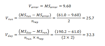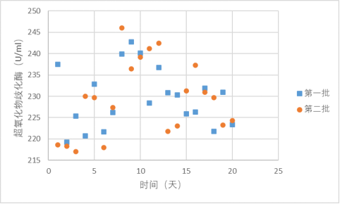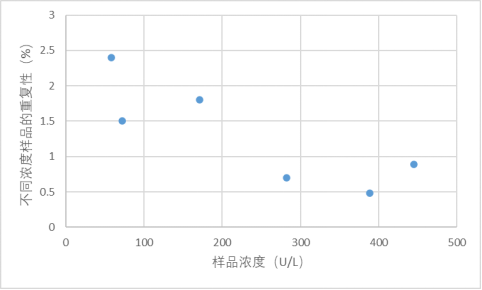 这是刘博谈准确度第八篇,本篇举例说明如何计算精密度。 7、举例说明如何计算精密度 7.1、重复性(批内精密度) 以丙氨酸氨基转移酶试剂盒产品其中一个批号试剂对低值样品进行测量为例,结果如表4.3.5所示。 表5|批内精密度实验原始数据记录表 表4.3.5中数据根据6.3.3标准进行分析显示无离群值。 根据公式(1)求出均值,均值为40.2 U/L,根据公式(2)计算出批内估计值的标准差。 丙氨酸氨基转移酶批内精密度为2.3%。 7.2、批间差 以白蛋白试剂盒产品为例,取3个不同批号的试剂,在质控合格的前提下对同一份样品进行测量,结果如表6。 表6|白蛋白试剂盒产品批间精密度实验原始数据记录表(单位:g/L) 表6中数据根据6.3.3标准分析显示3个批号测量白蛋白结果均无离群值。 根据公式(3)计算极差: 该白蛋白试剂盒产品的批间精密度为4.2%。 7.3、重复性和实验室内精密度(单点精密度)实例分析 本实例为单点精密度评价的数据分析,考虑到实验中可能会测量多个浓度样品,下面仅以其中一个样品的数据为例进行分析,原始数据记录详见表7。 实验设计遵循经典的20×2×2设计:使用一个试剂批号;使用一个测量系统;测试20天;每天测试2批;每批测试2次。 表7|超氧化物歧化酶( SOD )精密度评价原始数据记录表 (单位:U/mL) 80个数据来源于20天的重复测试,每批检测样品均来自同一份分装后的样品,可排除样品前处理或操作者的影响。无丢失数据,是一个平衡数据集。 为了观测异常结果,将每天每批每次重复测量的结果作图,如图1所示。 图1|超氧化物歧化酶精密度评价。代表20天每天2批、每批2次的测量结果,其中方形的点代表第一批测试结果,圆形的点代表第二批测试结果 从图1可以看出,无明显异常值。数据根据6.3.3标准进行统计分析,显示无离群值。 数据通过公式(4)~公式(8) 研究结果采用双因素嵌套方差分析,各变异来源的均方和结果见表8。 表8|超氧化物歧化酶方差分析结果 以上3种变异来源用来计算重复性SR和实验室内SWL的变异,即 重复性SR的自由度为 实验室内SWL的自由度为 80个测试结果的均值,变异系数为 精密度评价研究结果可用表9简单概括: 表9|超氧化物歧化酶精密度研究结果(重复性和实验室内精密度) 双因素95%置信限可通过公式(16)进行计算,将相关的DF、从公式(9)~公式(15)计算出来的结果输入,α = 0.05时超氧化物歧化酶样品的精密度置信区间如表10所示。 表10|超氧化物歧化酶精密度置信区间(95%,α = 0.05) 将上表中数据代人公式(16),得到重复性精密度、实验室内精密度在置信区间的上下限,如下所示: 以上为标准差,转化为CV需除以测量均值229.5 U/mL,再乘以100%,则精密度区间分别为:重复性1.1%~1.7%;实验室内2.9%~4.7%。 7.4、设备间精密度实例分析 下文介绍的设备间精密度(或多点精密度)研究模型为3台设备(或3个实验室)、多个浓度水平的样品精密度评估模型检测人血清中碱性磷酸酶(ALP)催化活性浓度。 3台设备均使用相同的样品。进行6个浓度样品的检测实验,临床混合样品按浓度由低到高依次标记为P1、P2、P5,同时采用的质控样品为Q3、Q4、Q6,原始数据详见表11。 表11|ALP 精密度评价原始数据记录表(单位:U/L) 数据通过公式(17)~公式(20)采用嵌套方差分析,各变异来源的均方计算结果如表12。 表12|ALP 精密度研究6个样品方差分析结果 利用表12数据通过公式(21)~公式(23)计算各样品的Verror、Vday、Vsite等,结果如表13所示,其中的百分比表示各分量方差占总方差百分比。 表13|ALP 精密度研究6个样品双因素嵌套方差分析结果 表13的数据再经过公式(24)~公式(26)计算,可得出各设备(实验点)的重复性、实验室内精密度、设备间精密度等数据,详见表14。 表14|设备间(实验点)精密度评价结果 以设备1的重复性为例,不同样品浓度为x轴、对应的重复性为y轴作图,绘制ALP的精密度曲线,如图2所示。 图2|ALP 不同浓度样品对应的重复性曲线(设备1) 表14的数据再经过计算,可得出各个样品测定的重复性、实验室内精密度和设备间精密度的95%置信区间,详见表15。 表15|ALP 各样品95%置信区间 8、方差齐性及Satterthwaite公式的应用 EP05-A3中涉及的方差分析为嵌套方差分析(也有称为巢式方差分析),其有效自由度的计算公式来源于Satterthwaite公式,下文对其进行简要介绍。 在进行方差分析时,理论上要求两个相应总体的方差相等,即所谓方差齐(homogneity)。即使两总体方差相等,也可能由于抽样误差导至两个样本方差不同,此时可进行方差齐性检验。 在进行两个独立样本的t检验时,常可出现方差不齐现象。 如果方差不齐,就要按照方差不齐的统计学方法进行样本处理,又称为t’检验(亦称近似t检验)。 方差不齐的处理方法有多种,如Cochran & Cox法、Welch法、Satterthwaite法等,Cochran & Cox法是对临界值校正,Welch 法和Satterthwaite法是对自由度进行校正。 Satterthwaite 法是应用较多的方法,有文献将校正后的 t 由度又称为有效自由度。 EP05-A3和EP15-A3中主要利用Welch - Satterthwaite公式得到校正的自由用来决定精密度验证允许上限的F值。下文结合单点精密度部分公式(9)公式(15)内容介绍Welch - Satterthwaite公式的应用。 Welch - Satterthwaite原始公式为 根据公式(9)~公式(15)可推导出以下公式: 将公式(34)通分整理后得公式(35): 根据Welch - Satterthwaite公式建立的原理,可得到以下公式: 从而得到公式; 以上为20×2×2单点精密度实验模型有效自由度的推