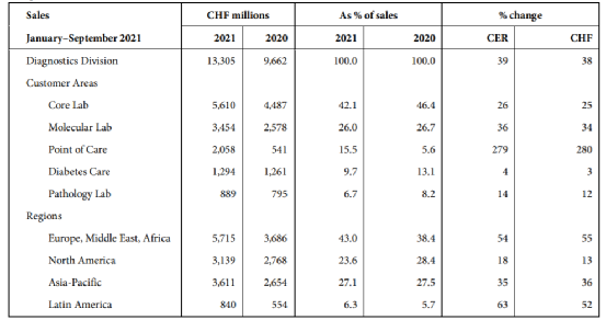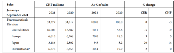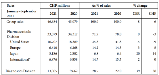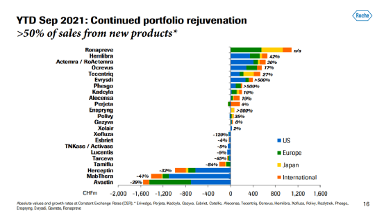 具体来说: 制药部门:产品迭代有序,收入增长超50%源自新药 制药部门前三季度营收保持稳定,收入334亿瑞士法郎,与去年持平。自夏季以来,已有从新冠大流行中复苏的迹象(第一季度:-9%,第二季度:+4%,第三季度+5%)。但肿瘤管线和免疫管线仍受生物类似药和疫情的影响。 在美国,前9个月的销售额受疫情影响下降了5%,但自夏季以来的销售额同比+稳定。受生物类似药竞争的影响,肿瘤药物MabThera/Rituxan、Avastin和Herceptin销售整体下降,但部分被Actemra/rocatemra、Hemlibra、Ocrevus和Tecentriq以及去年才推出的Evrysdi(脊髓性肌萎缩症)和Phesgo(乳腺癌)的销售所抵消。 在欧洲的销售额增长了3%。新药(Ronapreve、Ocrevus、Hemlibra和Kadcyla)的销售增长抵消了生物类似药的影响。 在日本,销售额增长了20%。增长的动力来自于新药Ronapreve, Tecentriq, Enspryng 和Hemlibra。同样大大抵消了生物类似药药和政府降价的影响。 在Perjeta和Ronapreve的强劲需求推动下,国际地区的销售额增长了2%。而中国的销售增长(+2%)主要来自Perjeta、Alecensa和其他创新肿瘤药物的持续强劲需求。 整体来看,前三季度罗氏的制药收入增长50% 以上源自新产品。 肿瘤领域,HER2产品组合中Kadcyla由于乳腺癌辅助治疗的获批,增长16%,帕妥珠单抗由于皮下注射剂Phesgo的上市增长4%,目前欧洲上市进程正在推进中。贝伐珠单抗在全球范围内都收到了生物类似药的狙击,销售额下跌39%,销售额排名从半年时的第3位下滑至第5位。PD-L1单抗Tecentriq继续保持强劲增长,由于一线肝细胞癌和一线小细胞癌大适应症助力,销售额增长27%。 免疫领域,IL-6 单抗Actemra获FDA的紧急使用授权和WHO推荐,用于住院新冠患者细胞因子释放综合征的治疗。同时对于RA单药治疗,托珠单抗在欧盟五国市场中仍占据领导地位。特发性肺纤维化药物Esbriet受新冠影响销售额下跌 5%。Xolair在哮喘生物药市场处于领导地位,Q2其新剂型在美国获批,这一剂型便利性大大提高,患者可自行在家注射,有助于市场进一步拓展,前三季度增长8%。 面对生物类似药带来的威胁,罗氏正努力实现管线的替代和扩展。大量新产品有望提振该公司未来营收,包括大众十分关注的阿尔茨海默病“突破性疗法”药物gantenerumab、获得优先审查权的眼科药物faricimab等。 诊断部门:Delta变体驱动超预期增长 诊断部门在前九个月实现了39%的强劲增长,达到133亿瑞士法郎。与已经取得斐然成绩的去年第三季度相比,今年罗氏诊断部门仍同比+18%。而这样的增长主要是由Delta变体引起的新冠检测驱动的。 中心实验室业务由于其免疫诊断业务,销售额增长了26%,其中传染病和心脏测试是主要贡献者。所有地区的销售额都有所增长,但在亚太地区和欧洲、中东和非洲地区增幅最高。 分子实验室业务在病毒学业务的带动下,销售额增长36%。新冠检测由于Delta变体的出现而继续增长。所有地区的销售额都有两位数的增长,其中亚太和北美地区居首。 POC诊断事业部销售额继续大幅增长279%。SARS-CoV-2快速抗原检测是主要的增长动力,特别是在欧洲、中东和非洲地区。 糖尿病管理业务销售额增长了4%,主要增长源自血糖监测业务,如 Accu-Chek检测系统。 病理实验室销售额增长了14%,主要是由于高级染色业务的增长。 可见,罗氏在业界领先的新冠检测组合再次为该部门的整体销售增长做出了重大贡献。虽然随着疫情逐渐放缓,对于新冠诊断红利业内并不看好,但显然罗氏抓住了病毒突变的时机。 但在新冠口服药研发方面,罗氏遭遇了失败。 新冠口服药研发失败, 与史上最赚钱药物之一擦肩而过? 就在财报发布前一日,罗氏/Atea公布其新冠口服药AT-527二期临床最新数据。报告显示,AT-527治疗组总体人群第29天SARS-CoV-2病毒载量较基线的变化与安慰剂组相比并未明显降低,仍有大约2/3的患者属于伴有症状的低住院风险患者,未能到达研究的主要终点。 据悉,本次试验的失败可能是因为招募了过多轻度甚至接种过疫苗的患者,最终导至与对照组相比,差异并不显著。 今年4月罗氏启动了AT-527对于未住院轻中症患者的Ⅲ期临床试验,并且其 6 月 30 日公布的中期分析结果显示,服用 AT-527 的受试者实现了从第 2-8 天病毒载量的迅速降低,到第 14 天约 47% 的患者病毒清除,高于对照组的 22%。彼时,罗氏及其合作伙伴乃至业界、投资人等都对 AT-527 的“前程”相当乐观。 Atea首席执行官Jean-Pierre Sommadossi表示,目前Atea正与罗氏 “评估后期研究的潜在调整方向”。然而,投资者似乎对此并不买账。 此消息一出,美股Atea暴跌70%。 相比之下,默沙东开发的口服抗新冠病毒药物莫诺匹韦(Molnupiravir)则一举成名,数据显示该药能够降低50%住院或死亡风险。据此,默沙东已于10月11日宣布向FDA提交了莫努匹韦的紧急使用授权申请。尽管争议缠身,但并未阻碍莫努匹韦的“火爆”的脚步,尚未获批就已引发多国抢购。目前已有约10个国家或地区跟默沙东公司签署协议或正进行谈判。 新冠口服药甚至重挫新冠疫苗股,罗氏新冠口服药的研发失败,可能意味着与史上最赚钱的药物之一擦肩而过。后续是否会有机会翻身,我们拭目以待。 未来布局:神经、肿瘤、眼科等研发管线 截至今年9月底,罗氏启动了14项3期临床试验,17个新分子实体(NME)处于关键性临床开发阶段。罗氏正积极实现管线的替代和扩展,后发管线潜力可期。 在制药方面,