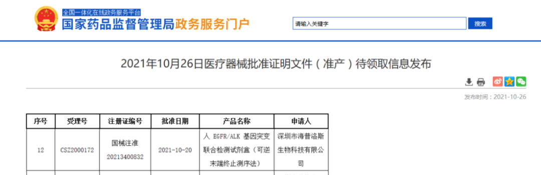 2021年10月26日,由深圳市海普洛斯生物科技有限公司(以下简称“海普洛斯”)自主研发的“人EGFR/ALK基因突变联合检测试剂盒(可逆末端终止测序法)”获得国家药品监督管理局(NMPA)三类医疗器械注册证(国械注准20213400832)。 这是国内持证IVD产品中,首个最低检测限达到0.5%的NGS伴随诊断试剂盒。 人EGFR/ALK基因突变检测试剂盒是海普洛斯为指导肺癌靶向用药研发的试剂盒。该试剂盒可用于非小细胞肺癌(NSCLC)患者在吉非替尼、盐酸埃克替尼、甲硫酸奥希替尼等药物的伴随诊断检测。值得一提的是,该试剂盒可检测出低至0.5%的基因突变,达到行业最高水平。 肺癌是中国死亡率及发病率最高的癌症之一,而NSCLC占肺癌患者总数的85%以上。随着医学发展,多种治疗NSCLC的靶向疗法被开发出来并且获得各国批准,但并非所有的NSCLC患者均可受益,因为靶向疗法需要相应的伴随诊断来筛选合适的药物。 人EGFR/ALK基因突变检测试剂盒可用于NSCLC患者EGFR基因的L858R、T790M突变、19号外显子缺失以及EML4-ALK的基因融合,通过专业的生物信息分析软件体系分析基因序列,实现对样品DNA中突变的检测,以达到突变频率在0.5%~1%的变异仍可准确检出,有效避免漏检!同时,其灵敏度和特异性可以达到100%。 伴随诊断用途的基因突变类型及相应的靶向药物