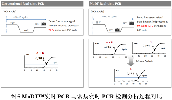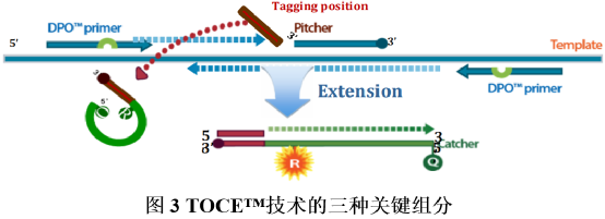 一、DPO™技术 1.原理介绍 Dual Priming Oligonucleotide(DPO™)是一种新型的多重靶标扩增引物设计方法,可提高靶标检测特异性,减少非特异性扩增。该技术可用于“一管多重”检测,也适用于多重实时PCR检测。 DPO™引物结构不同于常规引物,由三部分组成。5’端部分相对较长,是引物退火过程中的稳定序列;3’端部分相对较短,是引物延伸的决定序列;中间插入的多聚脱氧肌苷(Poly-dI linker),将两端的特异性功能序列连接起来。 2.特点分析 (1)DPO™引物的特殊设计,可阻断核酸多重反应中非靶标序列的错误延伸。在PCR过程中,即使DPO™引物的5’端长片段部分,结合至非靶标序列上,也会因为3’端无法互补配对而无法延伸扩增;DPO™引物的3’端由于片段较短,在退火温度中,无法单独结合至非靶标序列上启动扩增。 (2)DPO™引物的结构特点,使其在较宽的退火温度范围内,依然能保持良好的扩增特异性,其允许靶标序列在退火温度差别近10℃的情况下扩增。 (3)DPO™引物的独特结构,可避免形成引物二聚体和复杂的二级结构、防止多重靶标引物间的竞争,因此可实现单个反应中,多靶标扩增时的等效性和同步性。 (4)综合以上特点,DPO™技术特别适用于单管多重核酸检测。 1.原理介绍 Tagging Oligonucleotide Cleavage & Extension(TOCE™)是一种新型的多重实时PCR检测技术,可同时检测5个及以上的靶标基因和基因型。该技术通过设计独特的寡核苷酸,以及特殊的信号生成和熔解温度分析,克服了基于靶标序列的探针法实时PCR技术限制,充分发挥了多重实时PCR技术的检测潜力。采用TOCE™技术可检测和区分单个反应管中的多个靶标,还可通过cyclic-CMTA分析获取定量结果。 TOCE™技术的关键组分:DPO™引物对、Pitchers和Catchers,这三种独特的寡核苷酸,是该技术区别于常规实时荧光多重PCR的要点。其中,DPO™引物对用于靶标区域的特异性扩增;Pitchers是5’端带有标签序列的寡核苷酸,其3’端的特异序列部分可与靶标区域结合,但因3’端封闭而无法延伸;Catcher是双标记的人工合成模板,其3’端含有捕获序列,可与Pitchers 的5’端标签序列互补配对。 (1)TOCE™技术以人工设计的Catcher作为模板进行检测,在熔解曲线分析中具有诸多优势。其一,人工设计的模板Tm值不受靶标序列变异的影响,熔解曲线分析更加稳定可靠;其二,人工设计的模板Tm值更加可控,调整Catcher序列和长度即可设计不同Tm值的Catcher。通过分析每个荧光通道的Tm值,便可区分多重PCR检测靶标。目前Seegene可分析单个荧光通道中的5个靶标,因此对于四色荧光通道,在单管中便可检测20个靶标。 三、MuDT™ 技术 1.原理介绍 Multiple Detection Temperatures (MuDT™)是一种新型的实时PCR分析技术,可用于检测单一荧光通道中,多个靶标各自的Ct值。常规实时荧光PCR,在每个循环扩增中只采集一次荧光,而MuDT™需在每个循环扩增的两个不同温度,采集两次荧光,再利用这两个检测温度的荧光信号变化,结合软件分析,计算出同一荧光通道中两个病原体(如共感染样本)各自的Ct值。该方法无需通过熔解曲线区分不同病原体,通过两步实时荧光采集和软件分析,即可区分同一荧光通道下的两个病原体,因此可使常规实时荧光PCR仪的检测靶标数翻倍。 2.特点分析 (1)MuDT™技术通过改变荧光采集方式,并结合软件分析,提高了单一荧光通道的检测靶标数,无需对常规实时荧光PCR仪器进行硬件升级,最大限度利用现有实时PCR仪。目前Seegene可对同一荧光通道的三个靶标进行区分,这样便可将实时PCR仪的检测靶标数提升至三倍。 (2)通过比较不同检测温度下的荧光强度变化,区分病原体并计算出对应的Ct值,实现了单通道多Ct值的检测方法。基于该技术,可进行多重实时定量检测,也可用于SNP基因分型检测,同一荧光通道即可区分野生型、突变体或杂合体。 (3)Seegene开发的分析软件(Seegene Viewer)可兼容任何PCR仪,可自动分析多重实时PCR数据,对多重靶标的Ct值进行识别和区分。 参考资料 [1] Seegene官网. |