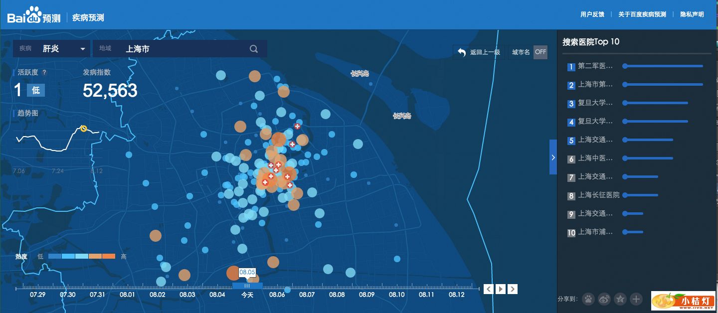 目前,百度疾病预测可提供流感、肝炎、肺结核和性病四种疾病的预测,并可对过去30天及未来七天的疾病变化作出预判。“活跃度”用来反映所选地域该疾病的活跃程度,同时也可通过1~99999的活跃指数反映。用户可以看到全国或者省某疾病指数排名前十的城市、区县,以及该疾病相关医院的搜索排行。