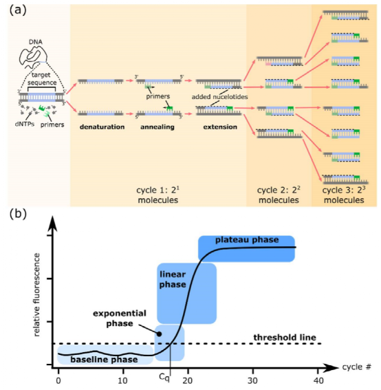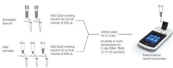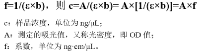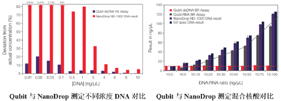 分光光度法是基于物质的光吸收特性来测定浓度的。核酸包含脱氧核糖核酸(DNA)和核糖核酸(RNA),是一种核苷酸聚合物,其核苷酸单体由戊糖、磷酸基和含氮碱基组成。其中,戊糖和磷酸可通过反应形成具有光吸收特性的产物,对此建立的分光光度法有定糖法和定磷法;而碱基本身便具有光吸收特性,可直接采用紫外分光光度法进行定量。(1)原理:核酸中的戊糖(核糖或脱氧核糖)在浓盐酸或浓硫酸作用下可脱水生成醛类化合物,该化合物进一步与某些成色剂反应形成有色化合物,在特定波长下具有相应吸收值,且在一定浓度范围内,溶液的吸收值与核酸浓度成正比,借此可对核酸进行定量。①RNA浓度测定:RNA与浓盐酸在共热时,RNA中的核糖可转变为糠醛,并与3,5-二羟基甲苯(地衣酚)在三氯化铁催化下,反应生成鲜绿色化合物,该产物在670nm处具有最大吸收值。该方法测定的RNA浓度在20~200ng/μL范围内,浓度与光吸收值成正比。②DNA浓度测定:DNA的α-脱氧核糖在酸性条件下可转变为ω-羟基-γ-酮基戊醛,其与二苯胺共热后可生成蓝色化合物,该产物在595nm处具有最大吸收值。该方法测定的DNA浓度在50~400ng/μL范围内,浓度与吸光值成正比。(2)特点:该方法特异性较差,凡戊糖皆可反应,其他糖类及其衍生物、醛类和蛋白质等会干扰实验结果,操作过程较为繁琐,如今已较少采用。 核酸是一类含磷化合物,磷酸基比例相对固定,其中RNA含磷量约为9.0%、DNA含磷量约为9.2%,因此通过定磷法确定磷含量后,便可推算出样品中的核酸含量。(1)原理:核酸分子的有机磷在强酸条件下被消化为无机磷,进而与钼酸铵结合成黄色的磷钼酸铵络合物,该络合物在还原剂作用下立即转变为蓝色的钼蓝,在650~660nm波长处具有最大吸收值。在一定范围内,根据吸光值与磷含量的正比关系确定无机磷浓度,进而确定核酸浓度。该方法测定的核酸浓度范围一般为10~100ng/μL。(2)特点:该方法测定的是样品中的总磷量,若样品中含有无机磷杂质,需通过对照组扣除无机磷含量,该方法灵敏度相对较高,但易受蛋白质和核苷酸影响。核酸分子上的碱基含有芳香环结构,具有紫外吸收特性,在250~280nm波长范围内具有强烈的光吸收能力,其中最大吸收波长位于260nm处。(1)原理:根据核酸在260nm波长处的光吸收特性,结合朗伯比尔定律,对核酸浓度进行确定。其中ThermoFisher的NanoDrop是当前较为常用的分光光度计,其测定样品浓度的数学公式为:研究者根据测试确定了不同核酸类型的系数f,其中dsDNA系数为50ng·cm/μL、ssDNA系数为33ng·cm/μL、RNA系数为40ng·cm/μL。将光程b归一化为1cm后,则吸光值A为1时,相当于dsDNA浓度约为50ng/μL、或ssDNA浓度约为33ng/μL、或RNA浓度约为40ng/μL。由此,可根据吸光度估算核酸的浓度,这种计算在许多仪器中可自动进行。①操作简单,无样品制备、添加染料或标准品等操作,上样体积较少,1~2μL即可。②灵敏度有限,以NanoDrop上的基座进行检测时,dsDNA的检测下限为2ng/μL、ssDNA的检测下限为1.3ng/μL、RNA的检测下限为1.6ng/μL,且无法区分DNA和RNA,当样品中包含其他核酸或游离核苷酸时,测得的总核酸量偏高。④仪器测得的数据中包含A260/A280和A260/A230比值,可初步评估核酸样品纯度,纯DNA的A260/A280约为1.8、纯RNA的A260/A280约为2.0,纯 DNA和RNA的A260/A230通常为1.8~2.2。(1)原理:利用荧光染料与核酸分子结合后,在特定波长光源激发下发出荧光,再根据荧光强度的高低对核酸浓度进行定量。该方法针对DNA和RNA有对应的特异性结合荧光染料,可对dsDNA、ssDNA和RNA进行区分检测。其检测过程需使用酶标仪或荧光计,以ThermoFisher的Qubit为例,测试过程中,需先使用标准品生成标准曲线,再对样本进行定量。大致过程为:将标准品和样本分别与检测工作液在专用反应管中混合后,室温孵育2min,再置于荧光计上读取数据。①定量过程需要制作标准曲线,操作过程相对繁琐,样本定量浓度的准确性受标准品影响,不在定量范围内的过高或过低浓度样本,均无法定量。②荧光检测过程对环境因素较为敏感,易受温度、光度等干扰,同时需使用专用的耗材和试剂。③相比NanoDrop,灵敏度和特异性均提高,可检测到pg级别。其中高敏dsDNA定量范围为10pg/μL~100ng/μL、ssDNA定量范围为50pg/μL~200ng/μL、RNA定量范围为250pg/μL~100 ng/μL;通过染料特异性结合,对dsDNA、ssDNA和RNA进行选择性区分测量,准确检测靶核酸分子浓度。从Qubit与NanoDrop的对比数据看,NanoDrop测量低浓度样本时,浓度偏差较大;在含有DNA和RNA的样品中,NanoDrop仅能测到总核酸量,而Qubit则可选择性区分定量DNA和RNA。(1)原理:通过在PCR反应体系中加入荧光染料或荧光探针,使得核酸扩增过程呈现出实时的荧光信号变化,且其扩增指数期对应的Ct值与起始模板浓度的对数存在线性反比关系,由此,结合已知浓度标准品建立的标准曲线,可对核酸进行定量。该方法是基于特异性的引物和探针来检测的,可用于确定靶核酸的拷贝数。①qPCR可用染料法或探针法,探针法还可使用多重检测。②特异性和灵敏度均较高,引物和探针的特异性确保只对靶核酸准确定量,不受非目标核酸和其他游离核苷酸的影响;通过扩增的方法对核酸进行定量,使得检测灵敏度可低至fg级别。③需要特定试剂和仪器,操作过程繁琐、检测时间较长,依靠标准品确定样品浓度,只有当标准品与待测样品具有相同扩增效率时,其定量浓度才准确可靠。(1)原理:数字PCR(dPCR)是一