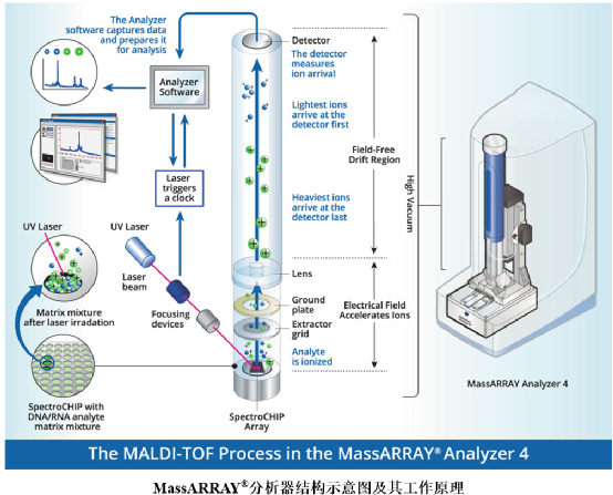 | 质谱技术自20世纪初诞生以来,已有100多年历史,期间有十多位研究者因在质谱的发明发展和研究应用上做出重要贡献而获得了诺贝尔奖。在其不断推陈出新的过程中,质谱技术的应用范围也逐渐拓宽,成为了重要的科学研究工具之一。而质谱技术对生物大分子的研究,则为其在生物医学领域中的应用埋下了伏笔,其中核酸质谱便是当前临床医学中极具应用潜力的工具之一。质谱技术(mass spectrometry)是分离和检测带电粒子质荷比的分析技术,相当于一台特殊天平,用于分类称量离子质量。以其高特异性、高灵敏度、高耐受性、分析快速与检测信息丰富的特点,越来越受到临床研究和诊断的关注。质谱技术早期在临床实验室的应用,主要是气相色谱质谱(Gas Chromatography MassSpectrometry, GC-MS)对军事药物使用的监测。但GC-MS主要适用于挥发性和热稳定性化合物,样品制备程序复杂,检测通量低,这限制了其在临床中的进一步应用。直至快原子轰击、电喷雾和辅助激光解析等“软电离”技术的发展,产生了诸如液相色谱-串联质谱 (liquid chromatography-tandem mass spectrometry, LC-MS/MS)、电感耦合等离子体质谱技术(inductively coupled plasma mass spectrometry, ICP-MS)和基质辅助激光解吸飞行时间质谱(matrix-assisted laser desorption/ionization time-of-flight mass spectrometry, MALDI-TOF MS)等新方法后,才使得质谱技术对蛋白质、酶、核酸等生物大分子的检测成为可能,也大大拓宽了其在医学检验领域的应用范围。其中,基质辅助激光解吸电离技术(matrix-assisted laser desorption/ionization, MALDI)据称是在一次误用化学试剂的操作中发展起来的,其发现者田中耕一也在2002年获得了诺贝尔化学奖(同步期待10月4日下午即将揭晓的2021年第一个诺贝尔奖项——诺贝尔生理学或医学奖,不知花落谁家)。该技术通过引入基质分子,使待测分子不产生碎片,解决了非挥发性和热不稳定性生物大分子解吸离子化的问题,实现了生物大分子的软离子化,便捷地将生物样本引入质谱系统,再结合飞行时间质量分析器(time-of-flight, TOF),实现了生物大分子(核酸、蛋白质和有机物等)的快速分析,产生了目前临床应用最为广泛的微生物鉴定、核酸分析等方法。MassARRAY®是美国Agena Bioscience(原Sequenom Bioscience)公司基于MALDI-TOF原理建立的核酸质谱分析系统,其基本原理是将预处理后的PCR扩增产物,通过仪器点样至带有基质的芯片上,使其与基质结合形成共结晶;再用激光照射复合物晶体,经辐射的基质分子吸收并积蓄能量后迅速升温,使得晶体升华进入气相状态,核酸分子也随之解吸并转变为亚稳态离子(多为单电荷离子);这些单正电荷离子可在加速电场中获得动能,并在飞过自由漂移区后向检测器飞行,且离子质量越小,飞行速度越快,也就更早到达检测器,不同分子量的核酸分子因到达检测器的时间不同而得到检测。该系统整合了PCR技术的高灵敏度、芯片技术的高通量、质谱技术的高精确度,以及生物信息的智能化分析功能,为临床研究与应用提供了另一个技术平台。核酸质谱是一把高精度的天平,可区分单个碱基的质量差异(G>A>T>C),而核酸质量又与碱基组成与长度有关,因此在PCR预处理过程中,使用不同方法形成碱基质量有差异的质谱待测物,则可实现核酸分子的不同检测目的。如通过单碱基延伸和分子切割的两种生物化学技术,使得核酸质谱可用于SNP检测和甲基化分析。单核苷酸多态性(SNP)是指在基因组水平上由单个核苷酸的变异引起的DNA序列多态性,其在遗传疾病的诊断和筛查以及用药种类及剂量指导等方面有着极其重要的作用。MassARRAY®可通过精确区分4种碱基的分子量差异,对SNP进行检测。其在PCR过程中采用了两轮扩增,从而生成了可用于质谱分析的单碱基延伸产物,详细技术原理如下:①在跨越SNP位点的上下游区域设计一对引物,该对引物的5’端带有10 mer tag(ACGTTGGATG),其目的是使第一轮PCR引物≥30bp(质谱图峰检测的范围是4500~9000 Da之间,而碱基平均分子量为300 Da,因此对应的核苷酸检测范围为13~30bp,这样第一轮PCR引物即使未能被后面的SAP完全消化,也不会出现在质谱图中)。该过程也可针对不同SNP位点设计成多重PCR,目前单个反应可达10~60重检测。由此扩增出含有SNP位点的第一轮PCR产物,加入虾碱性磷酸酶(Shrimp Alkaline Phosphatase, SAP)去除剩余的dNTP后,为第二轮PCR做准备。②针对每个靶点,在紧挨其SNP位点处设计一条单碱基延伸引物,并在体系中加入双脱氧核苷三磷酸(ddNTP),以第一轮PCR产物作为模板进行延伸,使得延伸引物在SNP位点处延伸一个碱基后即终止,由此每个SNP的等位基因延伸产物仅有末端一个碱基的差异。③将第二轮PCR产物与树脂混合,通过离子交换去除液体中吸附于DNA片段上的离子,再在系统上进行质谱分析获得图谱,根据延伸产物分子量的不同,于对应各自的分子量位置查看检测峰图。在人类基因组中,DNA甲基化一般发生在CpG位点(胞嘧啶-磷酸-鸟嘌呤位点),其胞嘧啶会在DNA甲基化转移酶的作用下与甲基基团结合转化为5-甲基胞嘧啶,作为一种重要的表观遗传学标记,在调控基因表达、维持染色质结构以及胚胎发育等生物学过程中发挥着重大作用。MassARRAY®可通过对前期酶处理后的产物分析,根据碱基G和碱基A之间16 Da的分子量差异区分出甲基化和未甲基化的C,并利用各自的峰面积计算出该CpG位点甲基化比例,从而估算整个检测片段内的平均甲基