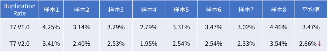 V2.0,是指DNBSEQ-T7的测序试剂盒2.0版本。从今年10月份起,华大智造正式在客户端启动DNBSEQ-T7全新升级,主要包括:全新版本的测序试剂(V2.0)、仪器控制软件和算法更新、配套MGIDL-T7(DNB自动化加载仪器)软硬件升级,具体而言:· 在生化层面,V2.0试剂配方更新,同时优化了滚环扩增时间,数据产出更高、更稳定。· 在软件层面,与V2.0测序试剂套装配套的仪器控制软件升级、算法升级,数据质量进一步抬升。· 在硬件层面,对MGIDL-T7进行了参数调优,优化了DNB加载流程。这一套“组合拳”下来,让已是“全球日通量最高测序平台”的T7的整体性能进一步提升,其中关乎数据有效率的Dup%值被“拿捏得死死的”,基于NA12878的单barcode WES文库 PE150测序(100X)应用上的测序结果显示:Dup%基本控制在5%以下,其他品牌同级别通量机型往往做到10%左右就已经是尽力了。表1 Mapping分析结果之Duplication Rate