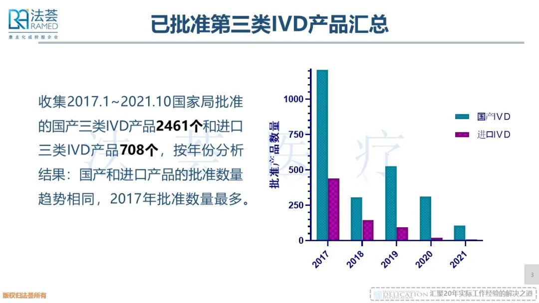 摘要: ●注册汇总本期法荟汇总了2018年1月至2021年10月已批准国产第三类IVD产品注册的公开信息。包括:技术平台类型分析、预期用途分析等,供大家参考。如信息有误,还望不吝指正。