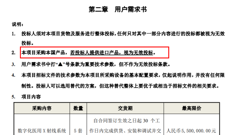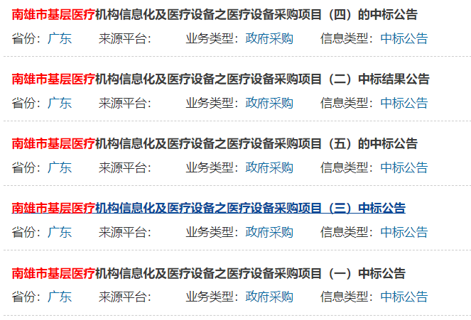 近期,又一地大批医疗器械采购尘埃落定,所有中标产品均为国产,迈瑞、安健、理邦、联影...... 千万采购大单尘埃落定 迈瑞、安健、理邦、联影...... 据中国政府采购网了解,广东省南雄市卫生健康局发布了一则招标公告,总预算近4000万为南雄市基层医疗机构采购一批医疗设备。 主要产品包括,磁共振成像系统、数字化医用X射线系统、彩色多普勒超声诊断仪、全自动生化分析仪、全自动血液细胞分析仪等22种医疗设备。 从结果的公布来看,本次千万级医疗设备采购大单中,国产医疗设备再次大获全胜,289台/套医疗设备最终中标价为3963万,全部为国产,迈瑞、安健、理邦、联影、优利特、翔宇等多家国产品牌中标。 包1总价为549万 数字化医用X射线系统5套,安健中标,单价格为109.8万 包2总价为992万 彩色多普勒超声诊断仪11台,迈瑞中标,单价格为79.94万; 尿液分析仪9台,优利特中标,单价格为4.98万; 核酸提取仪1台,博弘中标,单价格为11.98万; 实时荧光定量PCR仪1台,雅睿中标,单价格为24.98万; 健康一体机1台,汇医智中标,单价格为30.98万; 包3总价为989.5万 心电监护仪23台,迈瑞中标,单价格为2.75万; 全自动生化分析仪12台,迈瑞中标,单价格为49.8万; 全数字化彩色多普勒超声诊断系统12套,迈瑞中标,单价格为9.96万; 紫外线消毒车42台,巨光中标,单价格为700元; 数字式多道心电图机23台,迈瑞中标,单价格为5.9万; 电解质分析仪15台,康立中标,单价为4.7万; 包4总价为473.9万 全自动血液细胞分析仪10台,迈瑞中标,单价为29.99万 多功能抢救车8台,仁健中标,单价为8450元; 半自动体外除颤仪23台,迈瑞中标,单价为2.8万; 电脑中频治疗仪13台,翔宇中标,单价为2.776万; 两摇三折护理床58个,仁健中标,单价为5450元; 可视喉镜(成人)1个,优亿中标,单价为5.99万; 干式激光成像系统1套,锐珂中标,单价为3.99万; 经皮黄疸仪18台,齐力中标,单价为1.396万; 包5总价为958.5万 磁敏免疫分析仪1台,理邦中标,单价为9.65万; 磁共振成像系统1套,联影中标,单价为948.8366万; 基层医疗机构设备采购 首选国产 值得关注的是,南雄市卫生健康局公布的招标文件中,直接表明仅采购本国产品,若投标人提供进口产品,视为无效投标。 众所周知,为支持国产医用设备推广应用,广东省此前就发文表示,在不违反现行法律的前提下,严格执行《政府采购进口产品管理办法》,政府采购应当采购本国产品。 特别是一些大型医疗设备,明确市(县)级以下医疗机构首次配置大型医用设备的,以及市(县)级医疗机构配置第2台及以上的、地级市以上的医疗机构配置第3台以上的、明确用于特定专科使用的,原则上应选择国产设备。 同时,广东省还简化配置国产大型医用设备的审批程序,优化审批服务,将乙类大型医用设备配置的许可时限由法定的20个工作日调整为8个工作日,落实“马上办、网上办”。 不得不说,广东省在支持国产医疗设备上花费了不小的力气,特别是在《政府采购进口产品清单管理制度》严格实施之下,大批国产医疗器械品牌在政府采购中,增添了诸多优势。 而不仅仅是广东省,近年来多省发文明确支持国产医疗设备,除非中国境内无法获取或者无法以合理的商业条件获取,以及法律法规另有规定确需采购进口产品的,均须优先采购国产医疗设备。 并且,不得限制国产设备参与竞争,如因信息不对称等原因,仍有满足需求的国内产品要求参与采购竞争的,按照公平竞争原则实施采购,不得对其加以限制。 |