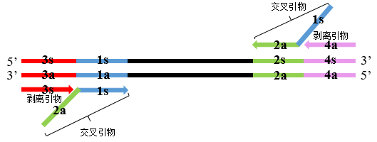 ①CPA单交叉引物扩增技术通过1条交叉引物,在扩增过程中形成发夹结构以实现循环扩增过程,最终的产物主要是2种双链DNA(1s/2a产物和1s/3a产物),序列分别为2a/2s-1s/1a-3s/3a-2s/2a和2a/2s-1s/1a-3s/3a。②循环过程中形成的1s/2a产物为双链结构,如何确保该双链DNA再次形成发夹结构是关键步骤之一,这可能在引物设计时,对2a/2s区域的选择有一定的要求。(1)引物设计:4个区域,2条交叉引物,2条剥离引物