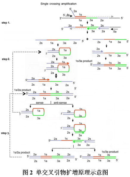 ①首先,交叉引物的1s序列与模板1a区域结合启动合成DNA;②同时,剥离引物4s与模板4a区域结合引导合成DNA,并置换出交叉引物引导合成的DNA链;③被置换出的DNA单链含有3s、2s和5s区域,可分别与检测引物3a、2a和剥离引物5a结合引导合成DNA链,同时外侧引物引导的合成链可置换出内侧引物引导的合成链,由此可形成2种单链DNA,其序列结构分别为5’-2s-1a-3a-3’和5’-2s-1a-3a-2a-3’(图2 step1);④其中,由检测引物3a引导合成的单链DNA(5’-2s-1a-3a-3’)的2s区域可与检测引物2a结合延伸,或者其2s-1a区域与交叉引物2a-1s结合延伸,最后均形成双链DNA产物(即1s/3a产物),产物序列为2a/2s-1s/1a-3s/3a;⑤同时,另一条由检测引物2a引导合成的单链DNA(5’-2s-1a-3a-2a-3’),由于自身含有互补序列2s/2a,可通过互补配对形成发夹结构;发夹结构的单链部分含有1a区域,可与交叉引物的1s序列结合启动生成双链DNA产物(即1s/2a产物),产物序列为2a/2s-1s/1a-3s/3a-2s/2a(图2 step2);⑥步骤⑤中生成的1s/2a产物的两条链可分别通过自身的互补配对形成发夹结构,其中正义合成链的发夹结构可继续与交叉引物结合,进入循环(图2 step2);反义合成链的发夹结构可与检测引物3a和2a结合启动合成DNA链,并同样形成1s/2a产物和1s/3a产物;其中1s/2a产物可继续进入循环扩增过程(图2 step3)。