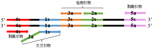 2. 原理 (1)引物设计:5个区域,1条交叉引物,2条剥离引物,2条检测引物- 5个区域:4s/4a, 1s/1a, 3s/3a, 2s/2a, 5s/5a