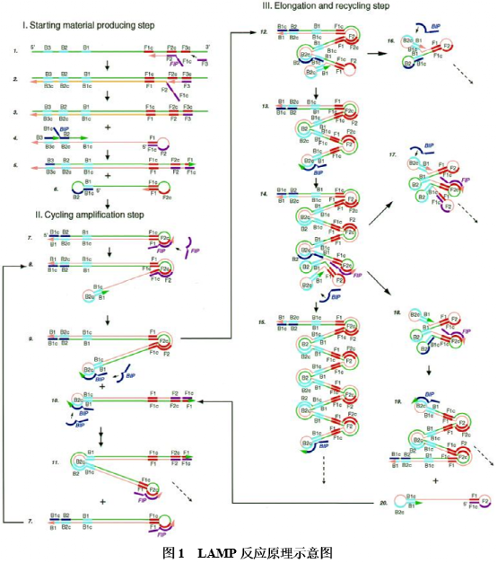 一、环介导等温扩增技术 环介导等温扩增技术(Loop-mediated isothermal amplification,LAMP)是2000年由日本荣研株式会社的Notomi等人提出的一种新型核酸扩增技术。 B3/B3c, B2/B2c, B1/B1c, F1c/F1, F2c/F2, F3c/F3①首先,内侧引物FIP(以FIP为例)的3’端F2序列与模板F2c区域结合,引导合成DNA(图1 step1);②同时,外侧引物F3与模板F3c区域结合,引导合成DNA,并置换出内侧引物FIP引导的合成链(图1 step2-3);③被置换出的DNA单链由于5’端含有F1c和F1序列,可互补配对形成环状结构;另外,单链DNA的3’端B2c区域可与内侧引物BIP的B2序列结合引导合成DNA,并被外侧引物B3的合成链置换出来(图1 step4-5);④最终被置换出来的DNA单链序列为5’-B1c-N-B2-N-B1-NNN-F1c-N-F2c-N-F1-3’,其5’端和3’端均含有可自身互补配对成环的序列(B1c/B1和F1c/F1),可形成哑铃状结构(图1 step6);⑤其中,3’端形成环状结构后,便以自身序列为模板引导合成DNA链;同时3’端环状部分的F2c区域为单链状态,可与内侧引物FIP的F2序列结合引导DNA合成,并置换出前面3’端自身引导合成的DNA链(图1 step7);⑥至此,LAMP将进入环介导的循环扩增过程,步骤⑤置换出的DNA单链3’端含有3’-B1-N-B2c-N-B1c-NNNN序列,B1/B1c序列可再次互补配对成环,并以自身为模板引导合成DNA,同时置换出前面合成的DNA链(图1 step8-10);⑦此时将生成一条茎环结构的DNA链(图1 step10)和一条互补的DNA链(图1 step9);⑧其中,茎环结构DNA的环状部分含有B2c区域,可与内侧引物BIP的B2序列结合引导合成DNA,由此便建立了循环过程(图1 step7-11);⑨步骤⑦的另一条互补DNA链将进入延伸和再循环阶段,由内侧引物引导链置换延伸反应,茎环个数逐渐增加, 最后的产物是一系列反向重复靶序列构成的茎环结构和多环花椰菜样结构的DNA片段混合物(图1 step12-20)。