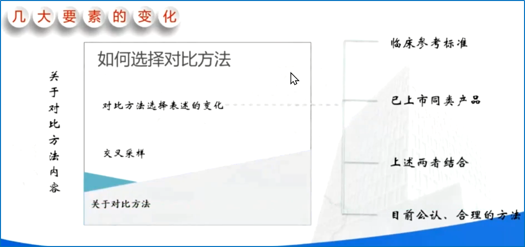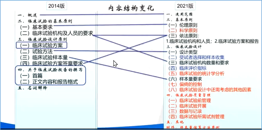 同时吕老师强调,大家对新规的关注点集中在伦理层面,出乎他们的意料,也并非修改新规的初衷。本次改版与之前版本相比发生了非常多重大的变化,尤其是在科学性方面的要求,然而目前针对新规的咨询没有太多关注到科学性方面,是当前中国IVD行业整体的科学素养已经完全get到新规精神,还是说尚未跟上形势达到政府对我们的期望?希望是前者吧,那么接下来简单梳理汇报一下培训的内容。 关注点——整体思路的变化 正所谓时也,势也。随着技术和国内IVD行业的发展,监管的思路和重点也需要进行调整。遥想当年,国内IVD刚刚起步,创新性的产品较少,更多的是跟着国际产品走模仿和替代的道路,所以之前版的指导原则更多的是从技术层面进行要求,比如1000例样本,与同类产品比较等,谈不上十足的科学性,但是更符合当时的行业可接受和理解的状况。 随着时间的推移,技术不断迭代,对疾病新的研究持续加快,便涌现出很多创新的产品,要么技术突破,要么临床意义进行拓宽,再按照原来同类产品比较的思路已经满足不了临床评价的需求。在这样的大背景下,才有了这次的改版,所以整体思路更加顺应当下创新的需求。 具体的表现在于: ▸首先明确IVD临床试验的目的:证明产品能够满足预期用途要求,并确定产品适用人群与适应症。而不是单纯为了跟一个同类产品比较性能…… ▸其次新增临床性能的定义:指IVD由预期使用者在预期使用环境中使用,针对目标人群获得与受试者目标状态相关的检测结果的能力。所以临床前研究重点是分析性能,临床研究重点是临床性能。 ▸最后定调本次指导原则的定位:明确临床试验的基本原则和临床试验中需要考虑的关键因素。也就是说不是教我们怎么写方案,而是在设计试验的时候应该遵从的原则以及考虑的因素。 关注点——内容结构变化 如下图所示,2014版和2021版内容结构发生了非常显著的变化: ▸首先,将临床试验方案和报告相关内容摘除了,方案和报告具体要求按照最新版的《医疗器械临床试验质量管理规范》(GCP)的要求来,这版将IVD纳入统一管理。也就是说,这版IVD临床试验指导原则不是教我们写方案的,而是在临床试验设计过程中,考虑和正确设置关键因素。 ▸其次,科学原则首次明确提出。以往的时候我们设计临床试验方案当然也需要考虑科学性,但是没有单独把这一条作为原则来讲,新版进行了明确。 ▸再次,临床试验设计环节篇幅大增。前面讲到,本版指导原则重在试验设计的科学性,因此对于受试者、样本、临床评价指标、统计分析和偏倚控制等内容进行了丰富,以期达到临床试验的真正目的——IVD能够满足预期用途要求,并确定产品的适用人群和适应症。 ▸最后,在GCP的基础上,额外补充关于临床试验质量管理的要求,以细化IVD特殊的要求。 关注点——机构与人员 ▸首先,最大的变化是对组长单位的要求。本次明确了所有临床试验均需要设置组长单位和协调研究者。组长单位伦理委员会负责审查伦理性和科学性,参与单位伦理委员会只需要接受组长单位审查意见,决定是否批准本机构开展。 ▸其次,利好我们IVD企业的一条,强调机构配合注册过程。在审评阶段有可能会有补充实验的发补要求或者对临床试验检查的要求,以往没有法规的约束,临床试验单位可能不会很好的配合,本次改版进行了明确,有了一定的法规保障。 ▸再次,吕老师也解答了统计学负责人的要求。临床试验统计学负责人应为具有相关专业背景、专业能力的人员,强调的是有统计学能力,不需要特殊的证书,可以是申办方人员,也可以是临床机构人员。 关注点——小结 本次改版报告层面有了重大变化,由小结代替了分报告。小结的内容简化了原来分报告的内容,更加重视附件数据表的内容。 关注点——样本量要求 本次改版另一个重大变化是临床设计要素当中对于样本量的要求。以往的200例和1000例这种一刀切的约束被解除,更多的是强调科学性和满足统计学要求。重点包括对统计学、样本类型、试验目的、目标人群、不同亚型/检测物、线性范围(定量)等因素的考虑。 同时,推荐了几种公认的样本量估算方法,原则是定性试验首推单组目标值法,仅在样本不易获取的情况下(如罕见病或稀有亚型)采用不设定临床可接受标准的抽样调查方法。 另外,现有指导原则已经明确试验样本量的,可以按照原则走,也可以按照估算方法计算,还是那句话,科学性原则。 关注点——对比方法选择 旧版中有对比试剂选用对比试剂,没有选用金标准的表述容易让人产生误解。新版在科学性原则的指导下,对方法学选择的表述更加理性和贴近临床试验开展的初衷。最大的原则是在目前条件下选择公认的合理的方法作为对比,可以是已上市同类产品(前提是临床意义明确),也可以是临床参考标准或者两者的结合。因此对于较新的产品,即使市面上出现了一个或者两个同类产品,其临床意义和临床性能未必进行了充分的证实,不必拘泥,科学为主。 关注点——偏倚控制 本次新增了偏倚的概念,如同风险管理应该贯穿IVD全生命周期一样,偏倚控制应该贯穿临床试验的全程,临床试验的设计、机构的选择、同步试验、盲法设置等等都是在对偏倚进行控制,提高临床试验的有效性。接下来的几个关注点也会反映对偏倚控制的要求。 关注点——入组标准 前面讲到临床性