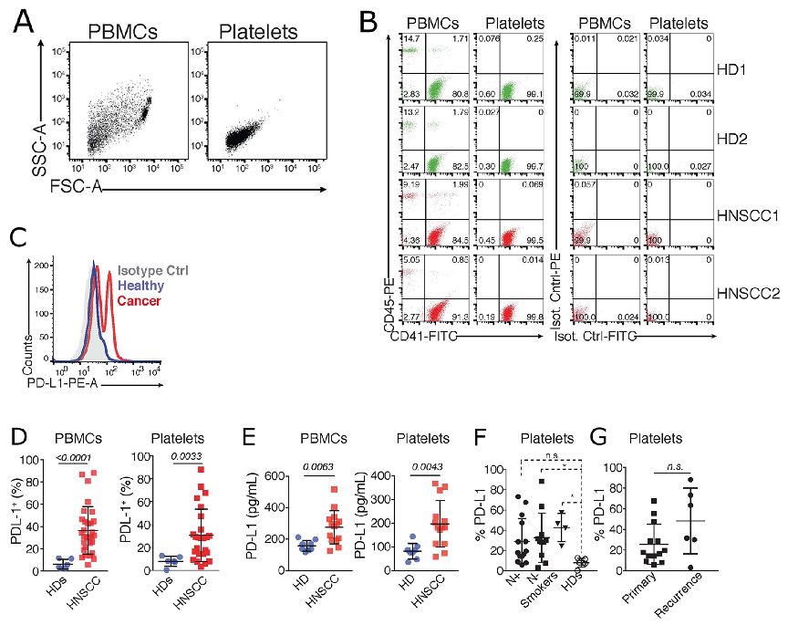 这项研究通过不同定性和定量检测方法(ELISA、ProcartaPlex多因子检测方法及流式抗体 ),检测吸烟者、头颈部鳞状细胞癌(HNSCC)或肺癌患者pbmc和血小板中PD-L1的表达,并证明PD-L1的表达上调与肿瘤分期无关。此外,在使用Atezolizumab(一种抗PD-L1的全人源单克隆抗体)进行治疗后,4例肺癌患者血小板中PD-L1表达下降,并持续20多天。如图C和E,使用流式抗体和Procarta多因子试剂盒(Immuno-Oncology Checkpoint 14-Plex Human ProcartaPlex Panel 1)同时验证HNSCC患者的PBMC和血小板样本中PD-L1表达上调。不同于其他检测样本,该研究作者以血小板作为检测样本,并证实PD-L1在血小板中高表达,说明血小板可能在癌症免疫治疗中也发挥着积极地作用,并在预后生物标志物研究中具有一定参考价值[2]。