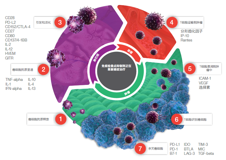 免疫检查点是指在免疫细胞上表达、能调节免疫激活程度的一系列分子,它们对防止自身免疫(免疫功能发生异常,对正常细胞发动攻击)作用的发生,起着重要作用。肿瘤细胞会表达一些物质,来激活免疫检查点,后者一旦被激活,就如同踩下“刹车“, 使抗原不能被提呈至T细胞,阻断了肿瘤免疫环中的提呈抗原过程,从而抑制T细胞的免疫功能,自己就能逃脱监视、存活下来。