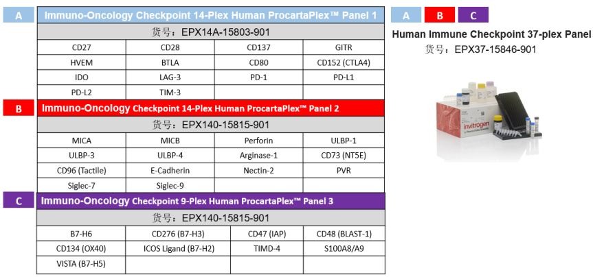 助力肿瘤免疫检查点的研究肯定少不了赛默飞生命科学的身影,赛默飞生命科学提供了一系列已验证过的高质量的肿瘤免疫共检查点筛选的多因子试剂盒,可以从少量珍贵样本中同时检测多达37种蛋白靶点(见下图)。