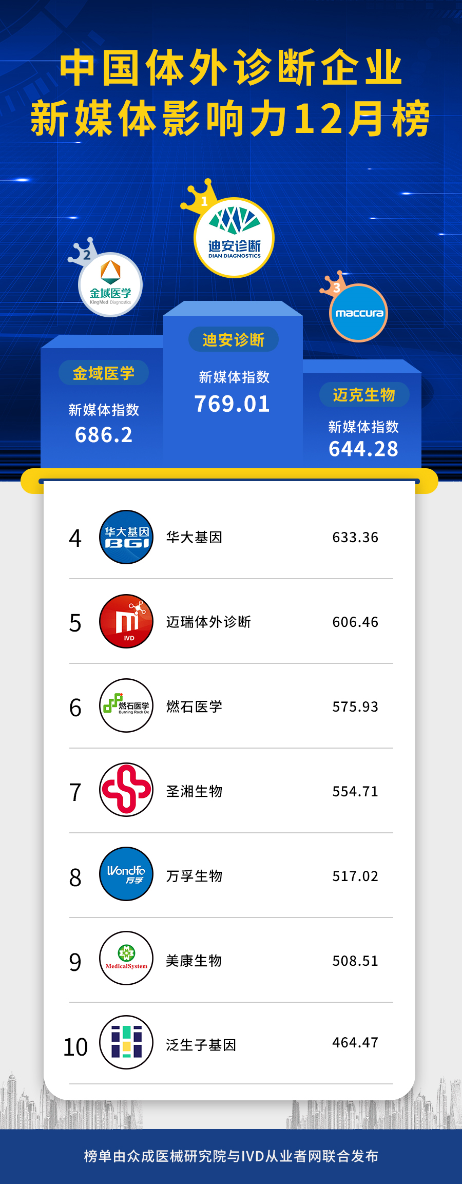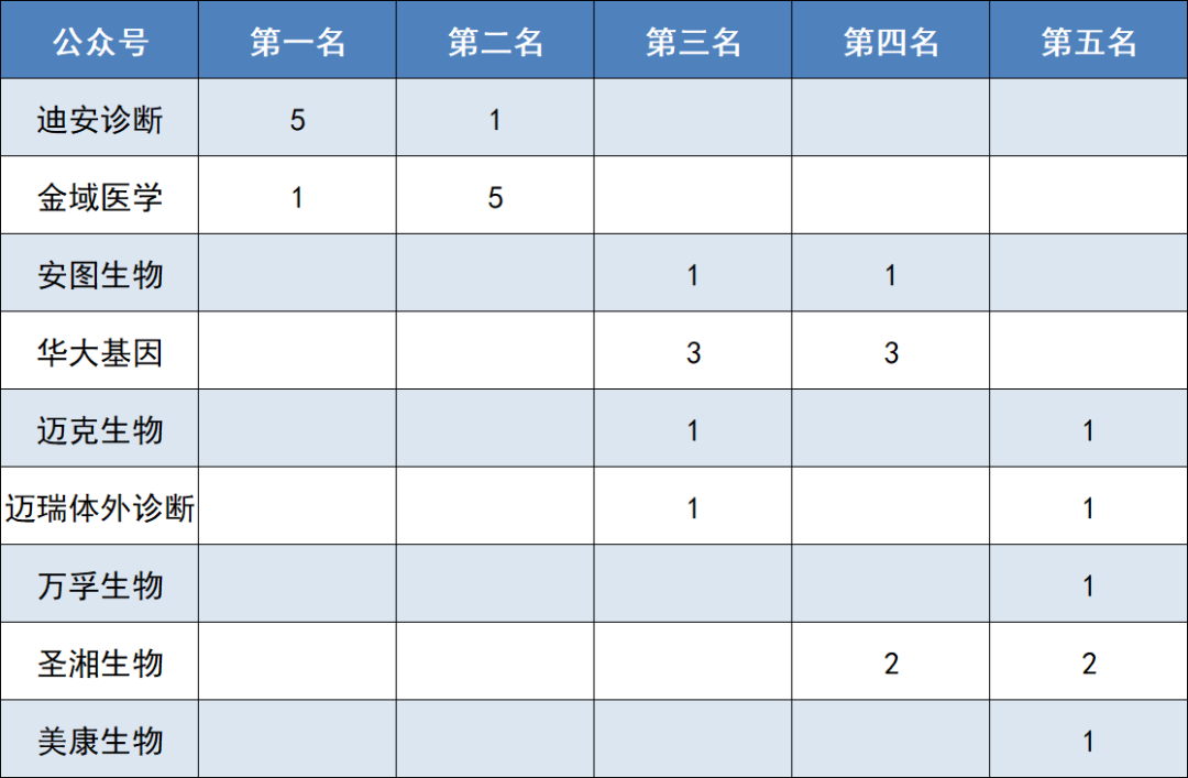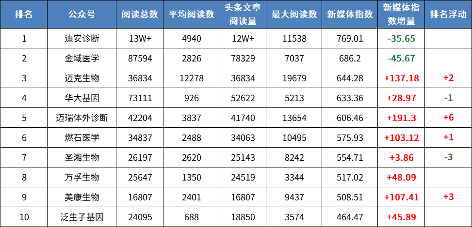 12月新媒体榜单数据及与11月份榜单浮动对比: (数据采集时间:11月1-30日) 中国体外诊断企业6-12月新媒体影响力前5名变化: 中国体外诊断企业新媒体12月榜正式发布,本次榜单是通过统计各企业官微11月份的发文数据而成。无法撼动的前二名,一直是迪安诊断、金域医学,尤其是迪安诊断,断层第一。其中迪安诊断的自媒体月度累计阅读高达13W+,金域医学的月度累计阅读达到了8W+,均略有下滑!最为瞩目的是迈克生物,继上月首次位列第五之后乘胜追击,本月强势进入前三甲,同时迈瑞体外诊断本月排名上升6个名次,来到了第五名,进步明显! 11月份迪安官媒的阅读量累计13W+ ,本月更新频次与篇幅与上月略有下降,新媒体指数增量有所降低,但依旧不影响其霸榜!Omicron毒株的奇袭,导至疫情再一次呈紧张之势,作为国内第三方诊断行业的先行者, “迪安雷迪”奔赴各地抗疫,紧急出击,迪安诊断的新冠检测试剂盒针对Omicron毒株做到不脱靶不漏检。同时,公司的业务合作、产品、学术会议以及公司取得的成绩等,每一步动向都是焦点。 稳居前二的金域医学官媒本月更新频次和篇数虽有所增加,但是阅读量依然在减少。作为第三方医学实验室的开创者和领导者,官媒内容过多集中在“猎鹰号”助力抗击疫情,当然,官媒内容还有金域新产品“小宏灯”上线以及公司的成绩和业务合作。 本月榜单,迈克生物继上个月排名上升9个名次来到了第五之后一鼓作气,本月排名继续上升2个位次,首次进入前三甲!迈克生物官媒依旧惜墨如金啊,仅有三篇推文,寥若晨星!本月焦点是i1000全自动化学发光免疫分析仪的问世,好产品配上好文案排版,如虎添翼;同时迈克生物新冠检测试剂盒针对Omicron毒株检测做到不脱靶不漏检。 本月华大官媒坚持不懈的日更,新媒体指数增量稍稍增加,但是跌出了前三甲,来到了第四。内容方面主要是Omicron对华大基因新冠检测试剂盒的检测性能没有影响,检测准确性及灵敏度不会降低,不会造成脱靶和漏检、公司合作动向、 “火眼”助疫、获奖等。 本月迈瑞官媒更新频次增加,排名上升6个位次来到了第五名,进步明显。本月的爆点是与万孚达成技术战略合作,引起广泛关注;与此同时,创新技术产品BS-2800M备受瞩目,以及SSA联检同样为公司添彩! 本月燃石医学官媒排名继续上升来到了第六。燃石医学广州最大办公楼启用是本月的重磅新闻,与默克和其他药企的战略合作同样备受关注;官媒内容还有公司的学术会议等。 本月圣湘官媒下跌3个名次,更新频次和篇幅与上月相比波动不大。本月圣湘生物出资5000万,与科华生物成立合资公司,强强联手,引起业内广泛关注。同样,关于Omicron毒株,圣湘新冠检测试剂盒对其有效;MEDICA展会中“圣湘方案”一如既往向全球输出,国际“朋友圈”持续扩大。 本月官媒更新频次颇频繁,新媒体指数增量小幅上涨,名次并没有波动。作为POCT行业龙头企业之一,万孚生物亮相MEDICA展会、与迈瑞体外诊断达成战略合作,是本月的两大亮点。同样,关于Omicron毒株,万孚生物新冠检测试剂盒可有效检出;官媒内容还包括公司的其他要闻、成就和“孚说漫画”板块。 本月美康生物的官媒更新频次有所增加,但也只有屈指可数的7篇, 排名上升了三名。作为浙江省体外诊断行业的“领头羊”,浙江省委副书记、代省长的考察调研备受关注;官媒其他内容主要是关于公司最新资讯、学术活动等。 11月官媒更新频次和篇幅没有很大波动,新媒体指数上涨。泛生子官媒的固定板块一如既往的更新,在企业要闻方面,泛生子与华西医院的合作、肝癌早筛技术纳入指南共识、与NeoGenomics达成战略合作以及人825基因突变检测试剂盒获CE认证都备受关注。 |