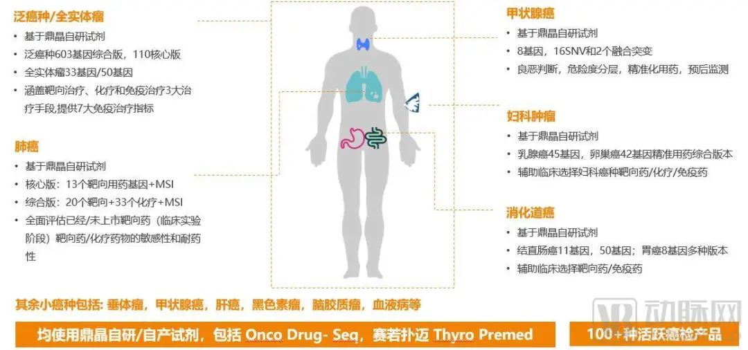 具体而言,鼎晶生物的癌检产品基本覆盖了现阶段有新药的癌症病种,如常见的肺癌、妇科癌、消化道癌、甲状腺癌、黑色素癌、脑胶质瘤、血液癌,及泛癌种等,总计活跃产品100+种,其丰富度和性能均处行业头部。