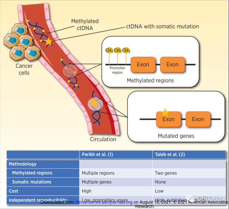 在治愈性治疗结束后,ctDNA中出现的体细胞突变对随后的影像学复发具有较高的阳性预测价值,特别是当这些突变与切除的肿瘤组织中的突变相匹配时。检测这种ctDNA定义的MRD可以在I-III期CRC中提前影像学数月预测复发,从而为一组最终会复发的CRC患者提供一个评估新疗法的窗口。然而,这些ctDNA体系突变定义的MRD检测方法的灵敏度仍然是有限的,迫切需要改进其检测性能。 ctDNA的甲基化检测优于ctDNA的体系突变检测。ctDNA的甲基化异常在CRC中非常常见,并被视为大多数肿瘤癌变的早期阶段。这种甲基化,具体定义为DNA中胞嘧啶的C5位置添加甲基基团,调节附近基因的表达,包括经典的肿瘤抑癌基因失活。与体系突变相比,CRC中存在更多的甲基化异常区域,为提高MRD检测的灵敏度提供了机会。SEPT9,就是第一个利用血液检测单基因甲基化异常进行筛查和早期检测CRC的方法。尽管ctDNA甲基化有这些优点,但这些相同的特性也需要谨慎,以保持检测分析的特异性,并尽量减少假阳性的可能性。 在这种背景下,Parikh和Taieb的这两项最新研究结果为我们对ctDNA性能的理解提供了有用的补充,即无需原发肿瘤组织,仅通过血液ctDNA甲基化或联合ctDNA突变即可进行准确的MRD评估。与其他需要对原发肿瘤组织进行测序以指导后续ctDNA分析的检测不同,这两项研究探讨了Tumor-uninformed assays的有效性,它有几个优势,包括快速的TAT,降低初始成本,对肿瘤组织不足或不可用的患者进行监测。 Parikh等人提供了一种ctDNA甲基化结合ctDNA体系突变的固定panel进行MRD的分析评估(NGS方法),与其他商业上可用的MRD检测方法相比,这种方法不需要切除的肿瘤组织以及定制化。在最终治疗后使用时,这种仅血浆ctDNA-MRD检测对复发具有临床意义的特异性(100%)和灵敏度(55.6%),通过整合表观基因组特征和纵向监测分析,其灵敏度可进一步提高至91%。1 该方法被用于正在进行的前瞻性研究,包括指导IIA期结肠癌治疗决策的NRG合作组研究(NCT04068103)。虽然还需要额外的数据集来验证这些发现,但这些结果证明了基于ctDNA的MRD检测在肿瘤不知情的情况下可接受的检测性能特征。 Taieb等人的研究利用了一对先前被证明是CRC切除后预后相关的甲基化基因标记物WIF1和NPY(ddPCR方法),并将它们应用于PRODIGE-GERCOR IDEA-France试验,将III期CRC患者随机分为3个月 vs 6个月的辅助化疗。在对参加III期试验的III期CRC患者进行的首次ctDNA-MRD评估中,有13.8%的患者术后为ctDNA-MRD阳性,并被确认为独立的预后标志物。3 同时,研究者也指出,与其他采用NGS方法的ctDNA-MRD研究相比,本研究中ctDNA的阳性率较低。灵敏度和PPV同样低于NGS检测结果,ctDNA-MRD阳性和阴性的5年DFS分别为65%和73%,尽管辅助治疗的疗效和不理想的前分析样本处理可能会对这些结果产生负面影响。该方法值得注意的是其相对简单,非常低的成本和潜在的重现性,不需要商业检测中所见的专利检测方法。正在进行的前瞻性研究将进一步评估仅血浆ctDNA检测是否能够准确评估MRD,以便对CRC患者进行风险分层,并指导辅助治疗决策。 无论采用何种方法,仅用血浆ctDNA-MRD检测来指导CRC患者的治疗决定,需要可靠且准确的检测方法。需进一步提高仅血浆ctDNA-MRD检测的灵敏度来确定哪些患者可以从治疗降级中获益,以避免不恰当地选择高危患者接受较低强度的治疗。Parikh及其同事的研究结果表明,整合基因组和表观基因组以及纵向血浆监测,可显著提高仅血浆ctDNA-MRD的灵敏度。相比之下,ctDNA-MRD检测的高特异性对于ctDNA作为一个完整的生物标志物来确定治疗升级是至关重要的。由于特异性不足,假阳性的ctDNA-MRD可能会使患者接受不必要的强化治疗。Parikh及其同事的研究结果证明,除体系突变外,还可以通过结合表观基因组甲基化特征的分析来保持特异性。Taieb等人的分析方法的优势在于提高了临床特征的灵敏度和预后,但是,正如研究者承认的那样,单独的两个基因甲基化标记可能无法提供与结合体系突变方法的性能特征。重要的是,这项工作也强调了标准化分析前条件的重要性,因为各种提取方法可以在很大程度上影响ctDNA的得率和完整性。在未来的研究中,这些分析前的考虑将变得越来越重要。 甲基化被纳入MRD检测的潜力是明确的,希望这些进展将继续提高下一代MRD检测的性能。总之,仅血浆ctDNA-MRD的检测提供了一个独特的机会,使用一种无创方法来探索治疗方案,并有可能根除高危患者的微转移性病灶。这些研究结果无疑为未来ctDNA-MRD指导的前瞻性临床试验铺平了道路。 MRD,仍然是一个快速发展的领域,我们预计近两年可能会出现新的证据,要么显示出MRD检测的临床效用的局限性,要么显示出MRD检测的其他优势和新用途。 参考资料: 1.Parikh Aparna R,Van Seventer Emily E,Siravegna Giulia et al. Minimal Residual Disease Detection using a Plasma-Only Circulating Tumor DNA Assay in Colorectal Cancer Patients.[J] .Clin Cancer Res, 2021, undefined: undefined. 2.Bent A, Kopetz S. Going with the Flow: The Promise of Plasma-Only Circulating Tumor DNA Assays. Clin Cancer Res. 2021 Oct 15;27(20):5449-5451. 3.Taieb Julien,Taly Valerie,Henriques Julie et al. Prognostic value and relation with adjuvant treatment duration of ctDNA in stage III colon cancer: a post-hoc analysis of the PRODIGE-GERCOR IDEA-France trial.[J] .Clin Cancer Res, 2021, undefined: undefined. 4.Benson Al B,Venook Alan P,Cederquist Lynette et al. Colon Cancer, Version 1.2017, NCCN Clinical Practice Guidelines