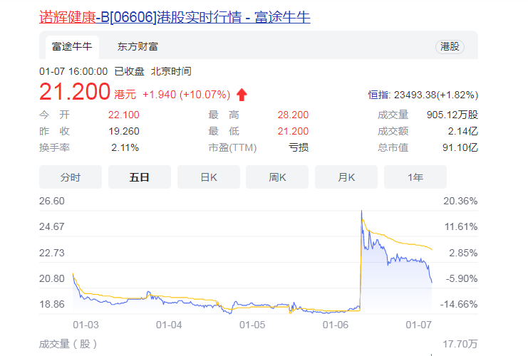 1月7日,诺辉健康股价一飞冲天,最高涨幅达47%。